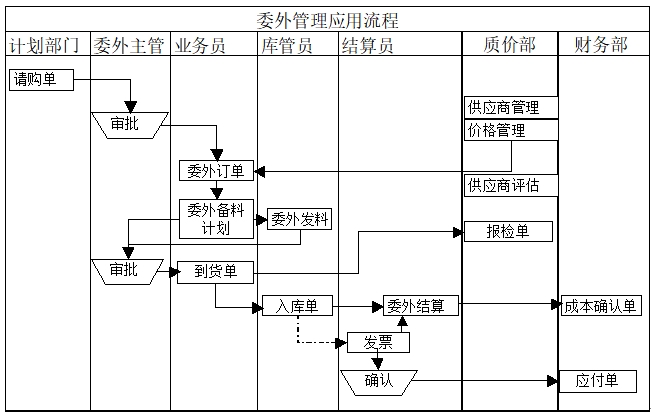 生產計劃系統生成的委外計劃訂單及車間訂單系統產生的臨時委外訂單經過確認生成委外請購單,委外管理系統接受請購單生成委外訂單,同時生成委外備料計劃,委外訂單發往委外廠家,同時按照委外備料計劃給委外廠家發料或定期批量發料;委外生產成品入廠后物流過程類似采購;委外結算過程除結算委外費用外,還要考慮委外扣料(對于長期委外廠家定期發料)的委外耗料的內部成本結算。