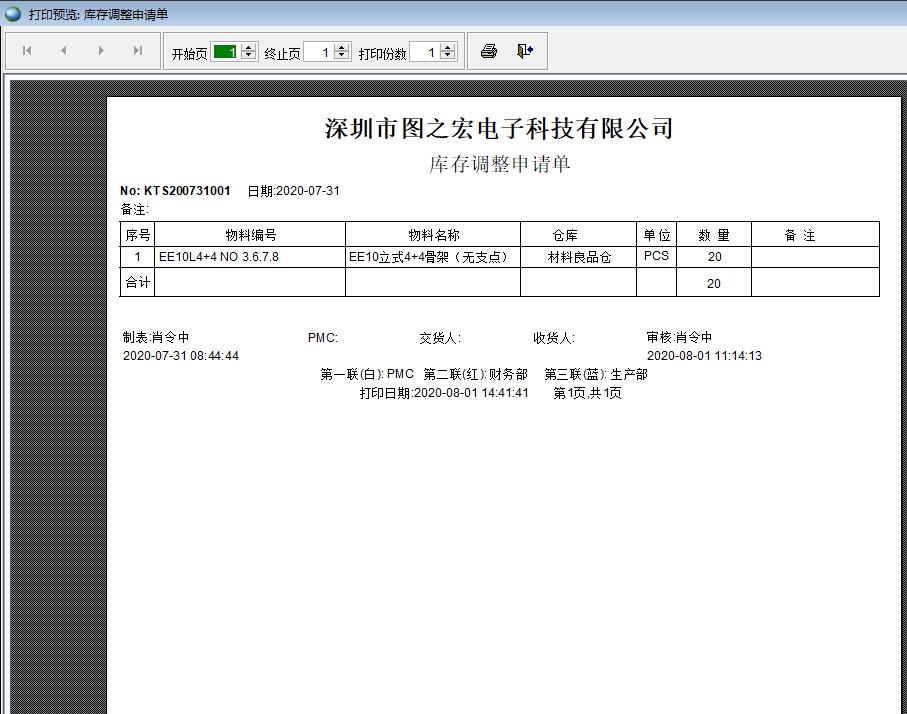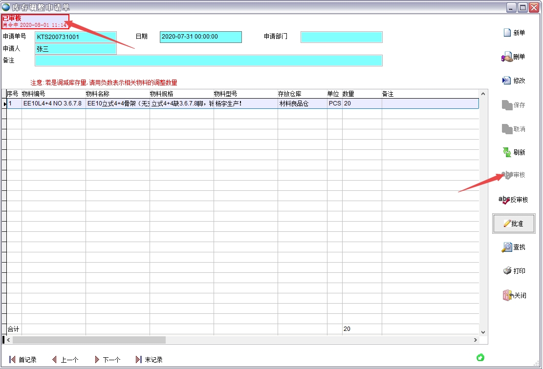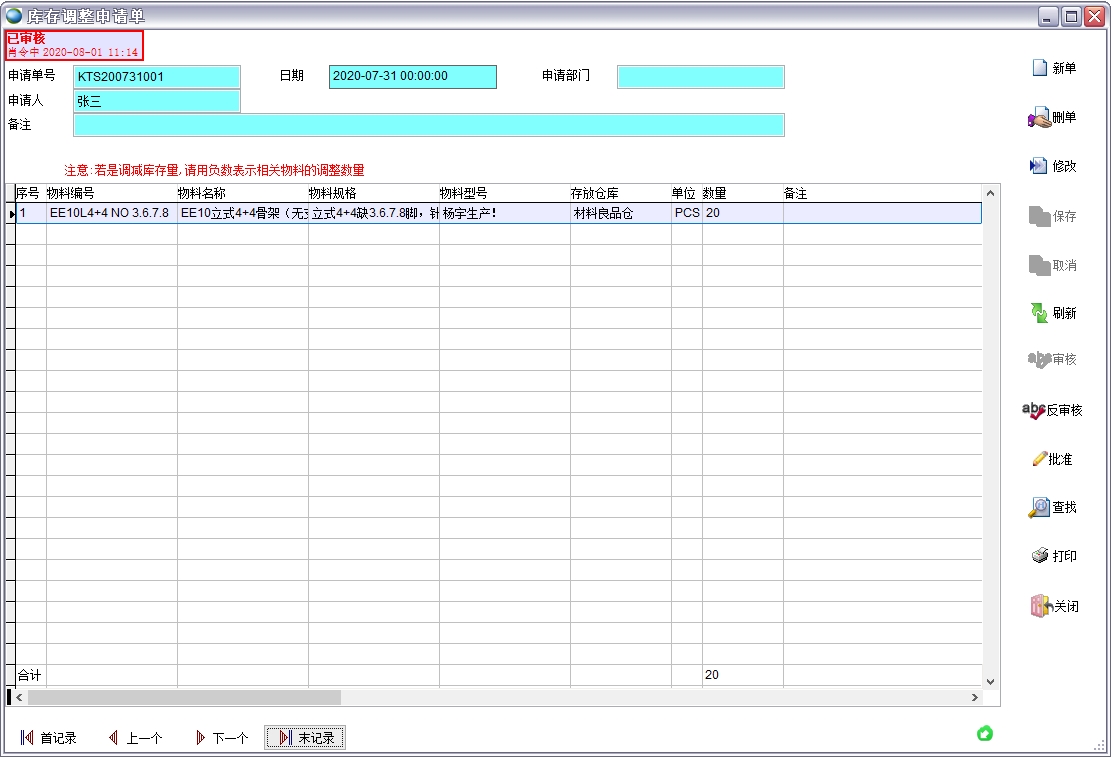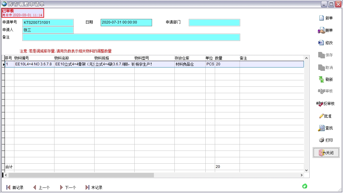 庫存調整申請單是做為修改庫存數量的申請單據,庫存調整申請單做完后,需要做庫存調整單引用庫存調整申請單,才能修改庫存量。