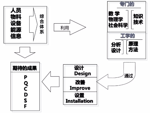 1955年美國(guó)工業(yè)工程師協(xié)會(huì)對(duì)IE的定義:IE是對(duì)關(guān)于人員、物資、設(shè)備、能源、信息等組成的整體系統(tǒng)進(jìn)行設(shè)計(jì)、改造與實(shí)施的一門(mén)學(xué)科。
