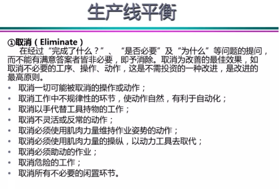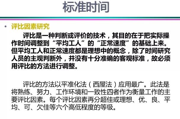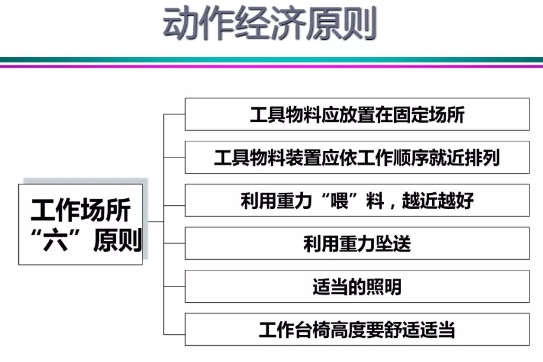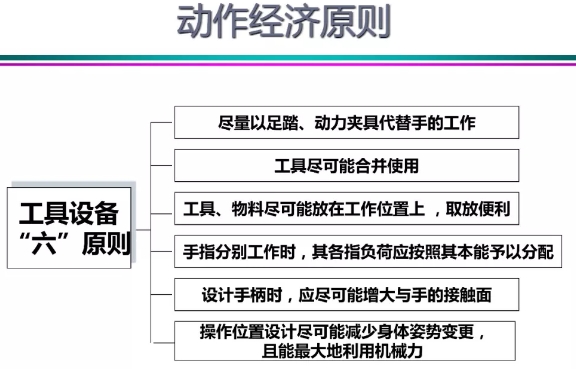 動作改善是指創造用力最少、不易疲勞,即舒適又能達到最高效率的途徑或方法,其重點是:尋求是操作人員舒適的工作場所布置,省時的工作方法,設法將作業人員的疲勞減到最低。