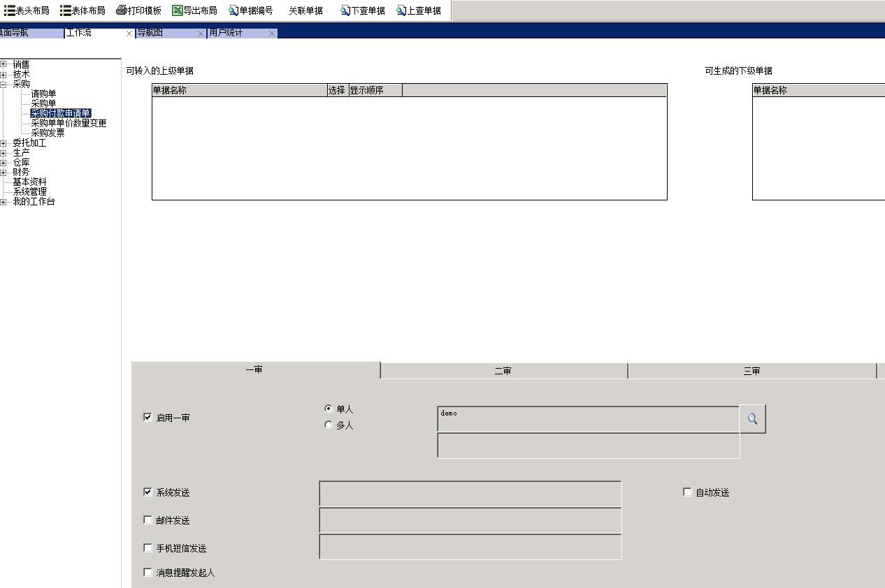 審批的工作流在ERP中設置,只有審批人可以進行審批,最多可以進行四級審批:一審、二審、三審、批準
