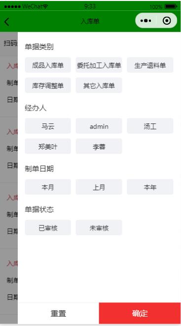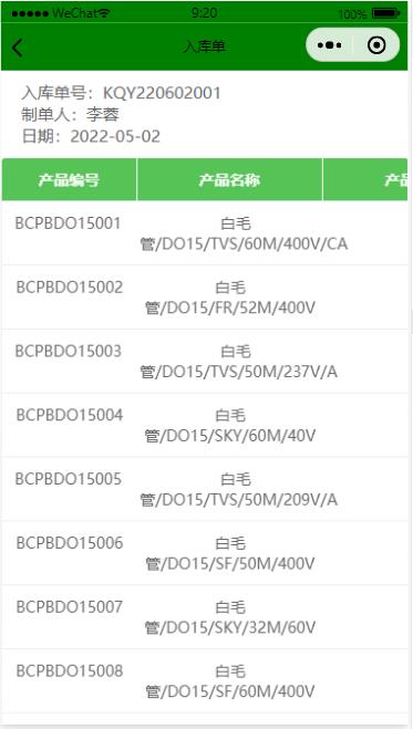 入庫單對應ERP中的各種入庫單,如采購入庫單、成品入庫單、其它入庫單、庫存調(diào)整單等,數(shù)據(jù)在ERP中錄入,同步到微信小程序端