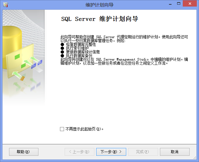 (1)在SSMS的對象資源管理器中右擊“維護計劃”,選擇“維護計劃向導”,系統將彈出向導窗口,如圖: