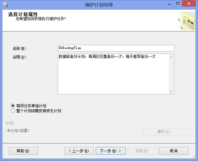 (2)點擊“下一步”按鈕,進入選擇計劃屬性窗口,輸入計劃的名稱,由于我們的計劃包括2部分:完整備份和差異備份,這2部分的執行計劃是不一樣的,一個是一周執行一次,另一個是一天執行一次,所以要選擇“每項任務單獨計劃”,如圖: