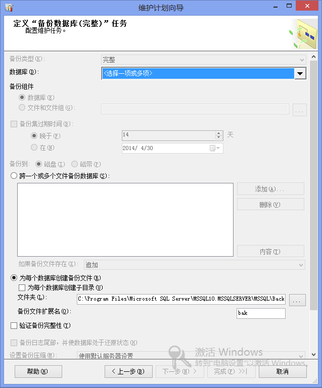 這個界面實在太長了,我把任務欄隱藏了都顯示不完,出現了滾動條,這里我們選擇要進行備份的數據庫,選擇為每個數據庫創建備份文件,文件保存在C盤Backup目錄下,擴展名是bak,出于安全起見,我們可以選中“驗證備份完整性”,當然也可以不選。在SQL2008中提供了壓縮備份的新特性,使得備份文件更小, 備份速度更快,這里我們就是由壓縮備份。最后是選擇執行計劃,我這里選的是每周日晚上0點的時候執行。