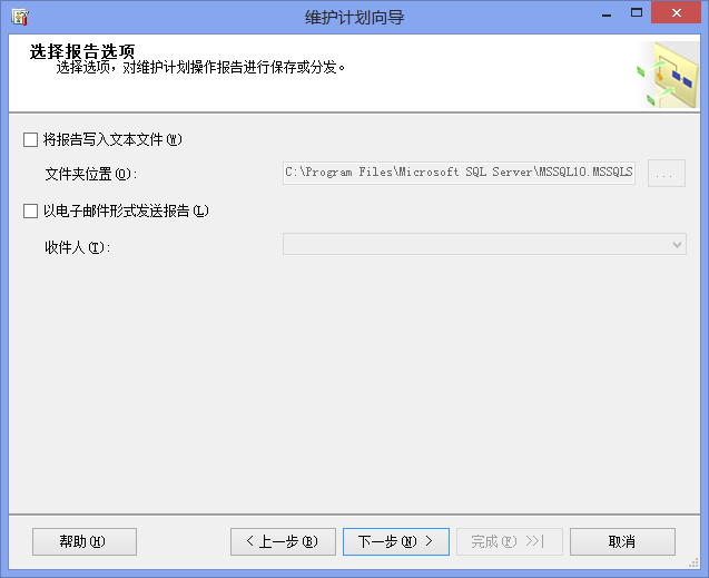 (7)單擊“下一步”按鈕,進入選擇報告選項,這里我們可以將這個維護計劃的執行報告寫入文本文件中,也可以講報告通過電子郵件發送給管理員。如果要發送郵件的話,那么需要配置SQL Server的數據庫郵件,另外還要設置SQL Server代理中的操作員,關于郵件通知操作員的配置網上也講的比較多,我這里就不詳述了。