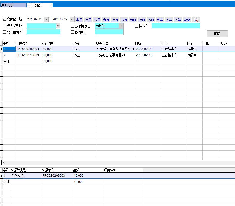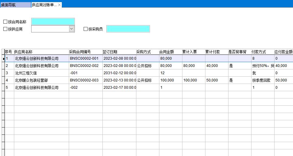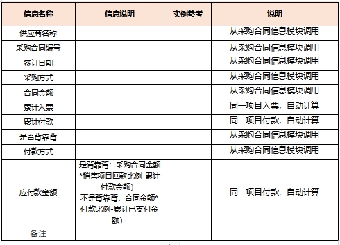 采購模塊由采購人員進行數(shù)據(jù)錄入與維護,采購人員對采購合同信息、采購發(fā)票信息、付款信息、供應商信息等基礎信息進行錄入,軟件能自動計算累計采購發(fā)票付款情況等相關數(shù)據(jù),并能根據(jù)要求的格式導出采購情況數(shù)據(jù)表(Excel格式)。