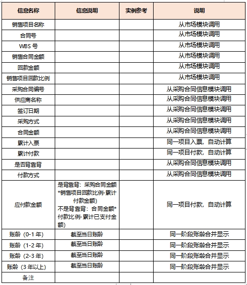 銷售部將銷售合同信息、銷售發(fā)票信息、項目回款信息及客戶信息等基礎數(shù)據(jù)進行錄入,軟件能自動計算累計開票回款情況等相關數(shù)據(jù),采購模塊與項目管理模塊能調(diào)用基礎數(shù)據(jù),并能根據(jù)要求的格式導出銷售情況數(shù)據(jù)表(Excel格式)。