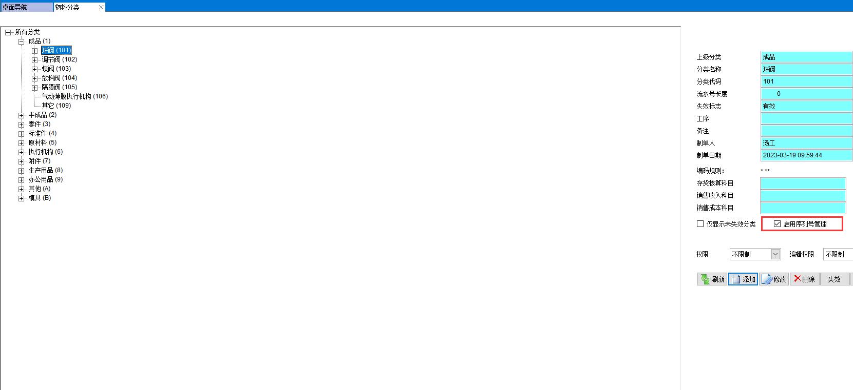 在物料分類上啟用序列號管理,可以對同一類別的物料統一設置序列號管理