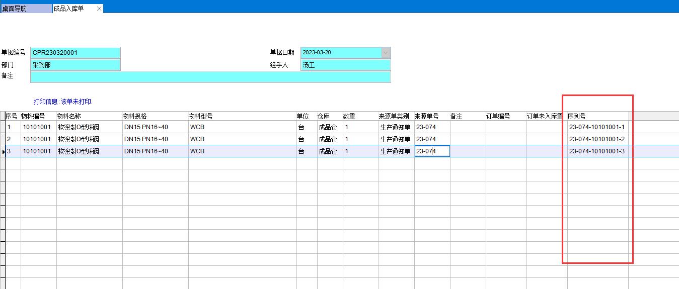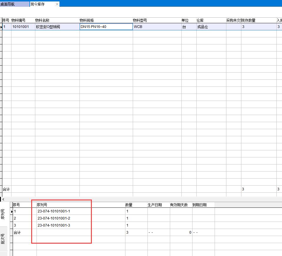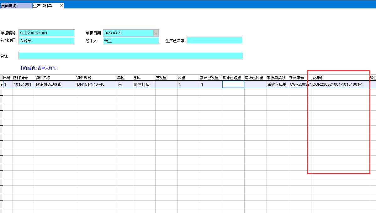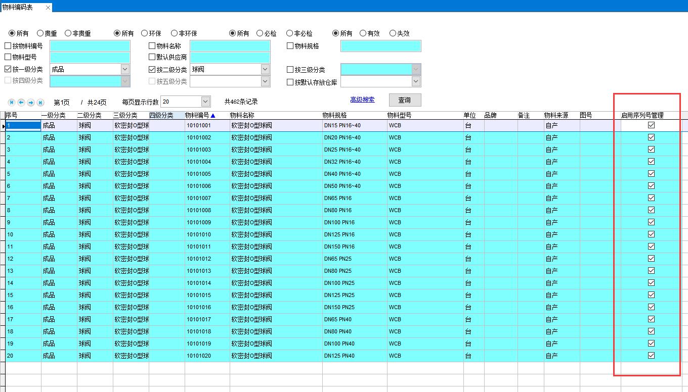 在物料編碼表中可以看到該分類所有物料都已經啟用序列號管理