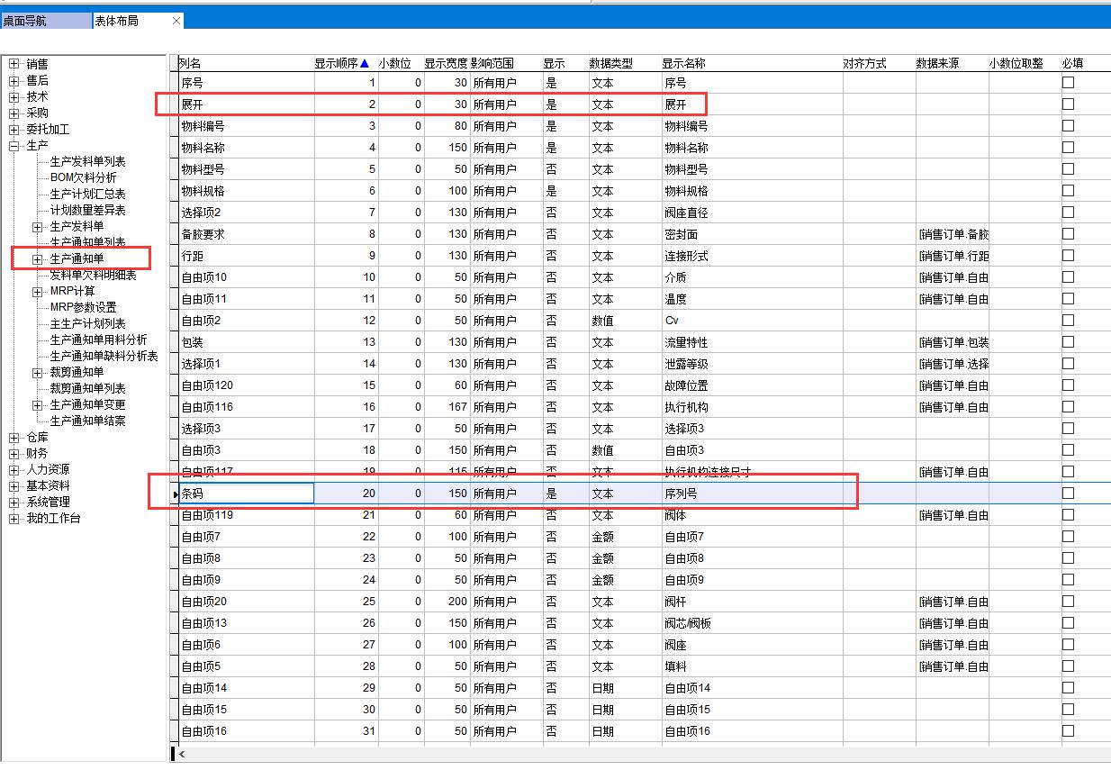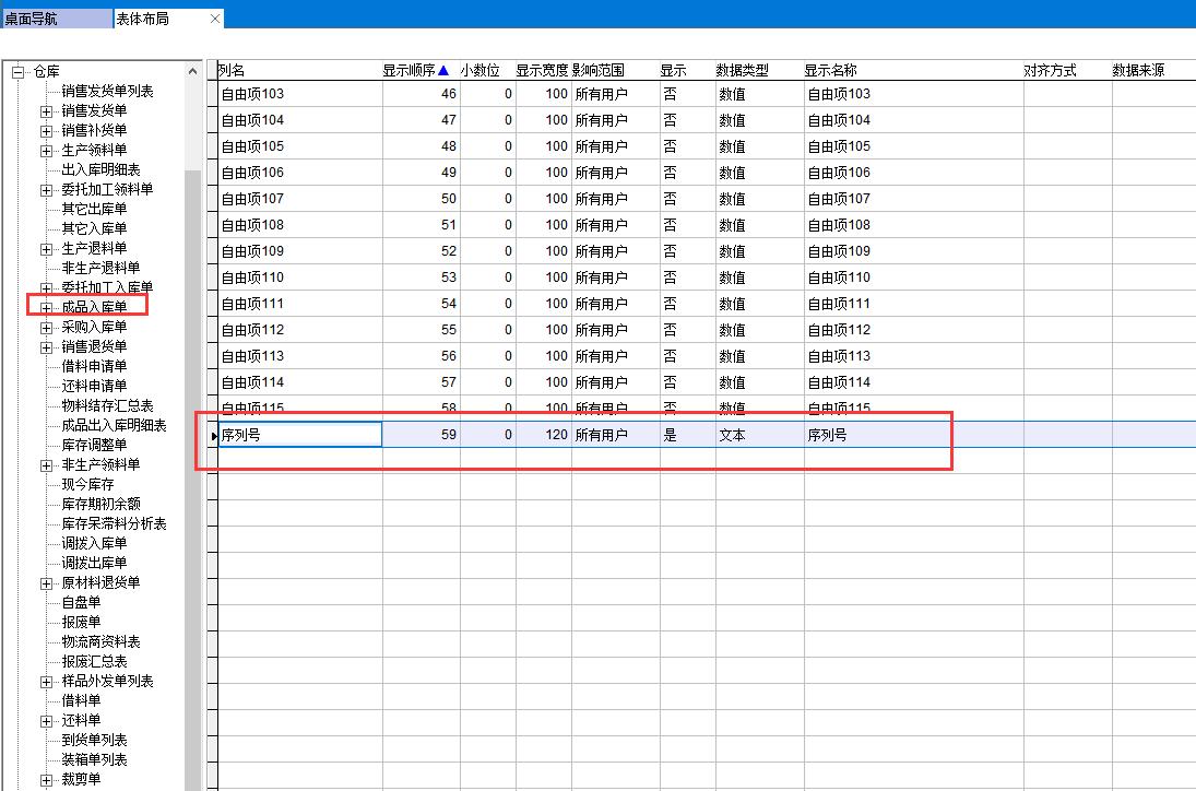 表體布局中將序列號字段顯示出來,默認為不顯示