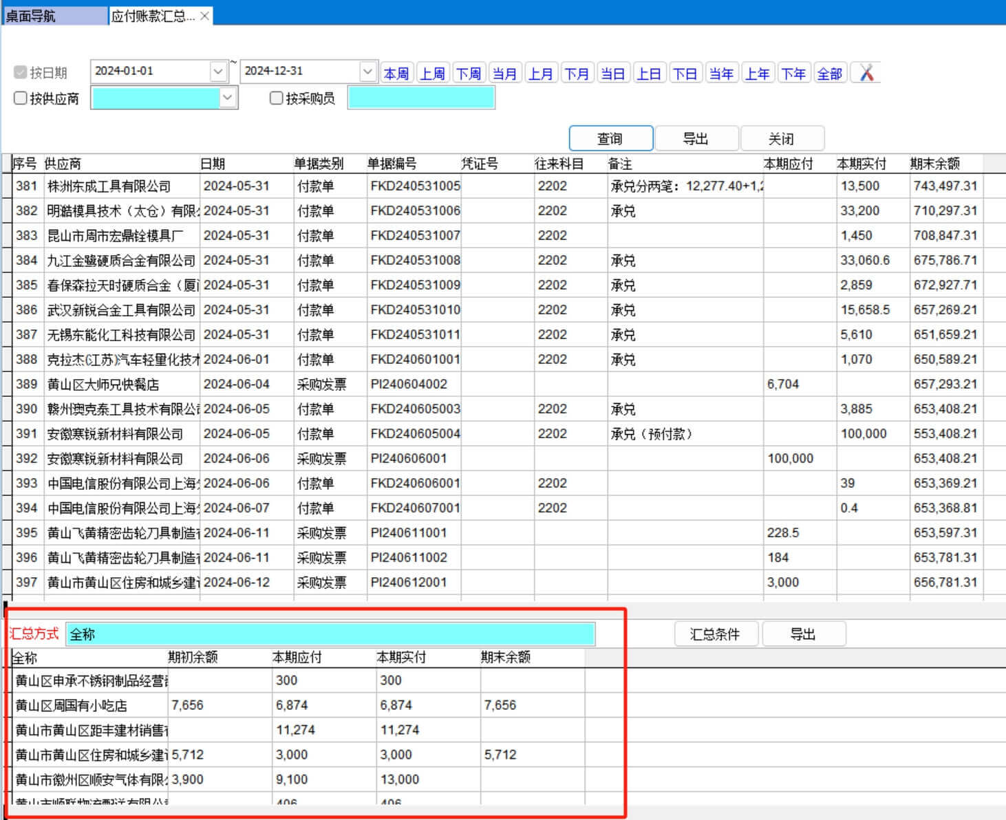應(yīng)付賬款匯總表用于按不同的匯總維度,查詢應(yīng)付供應(yīng)商的款項(xiàng)及余額