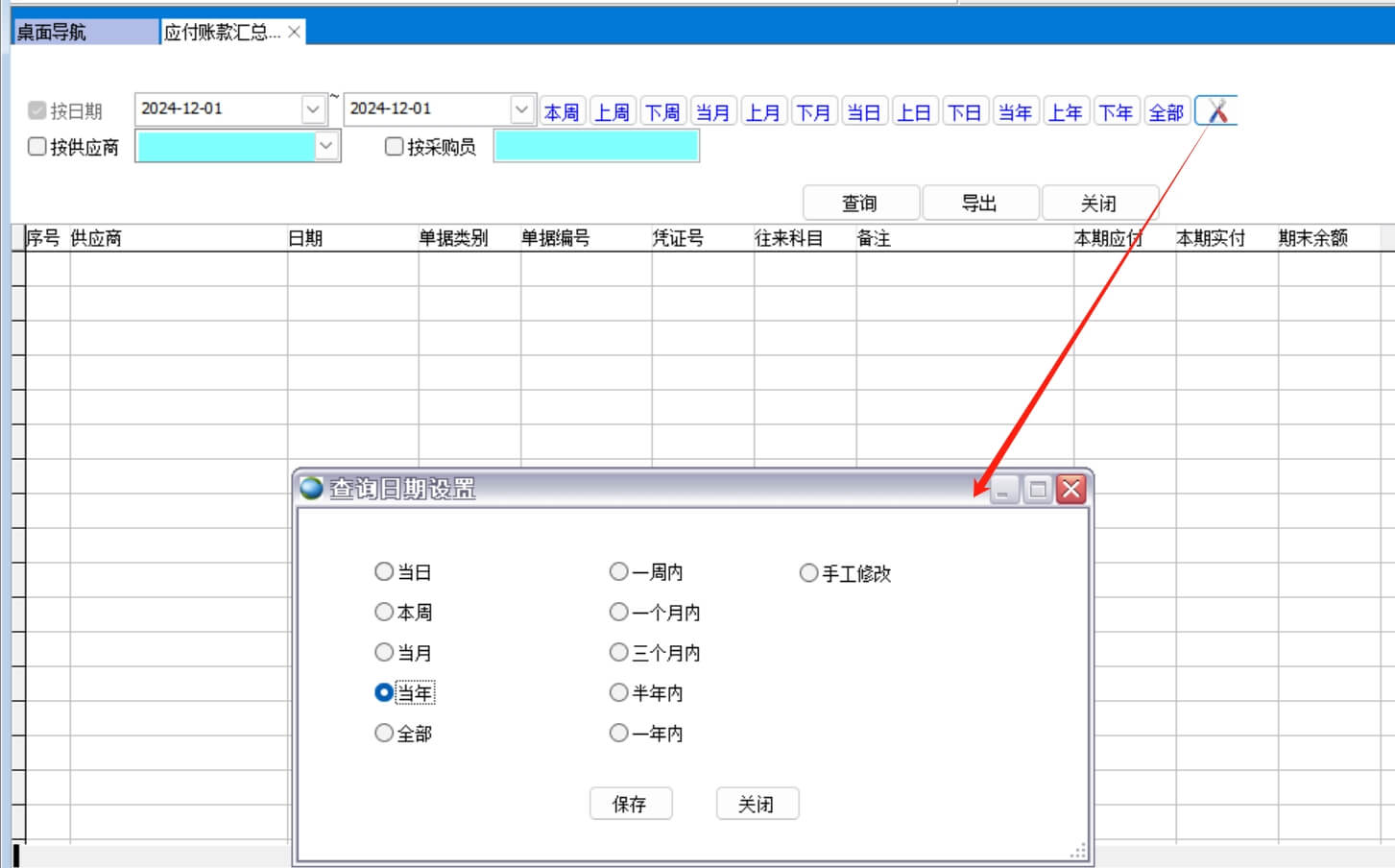 打開路徑:【主菜單】-【應(yīng)收應(yīng)付】-【報(bào)表】-【應(yīng)付賬款匯總表】