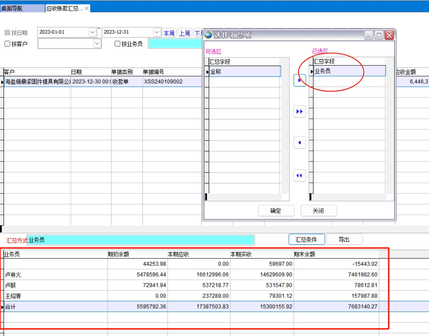 顯示每個業務員所屬客戶的期初余額、本期應收、本期實收、期末余額
