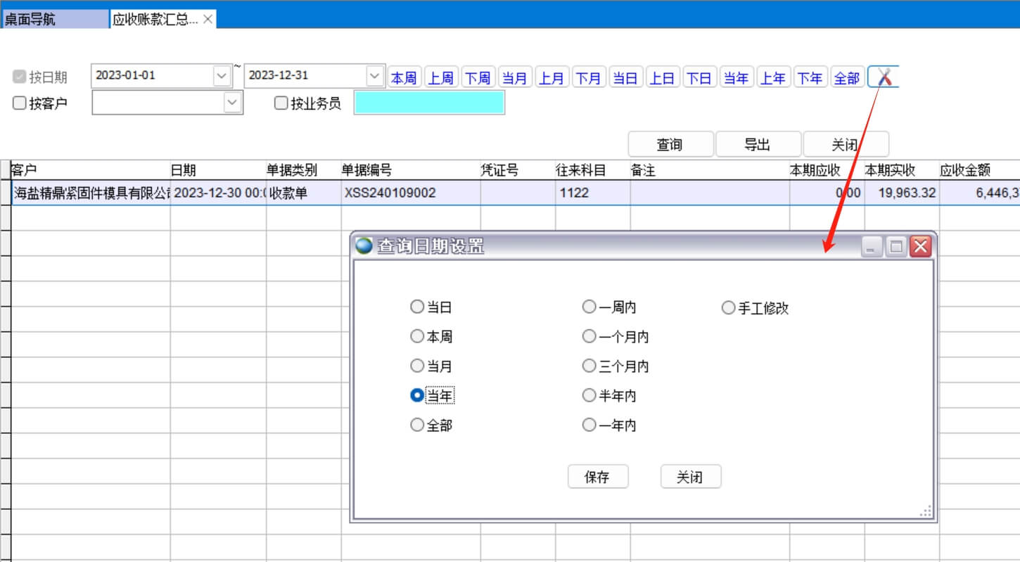 如下圖,設置默認的時間查詢范圍是當年,設置后重新打開應收賬款匯總表,默認時間范圍就是當年
