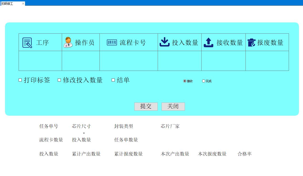 掃碼報工的操作界面非常簡單,由于是生產人員在車間現(xiàn)場用掃碼槍進行操作,因此盡可能的傻瓜式操作,避免員工誤操作影響生產進度。