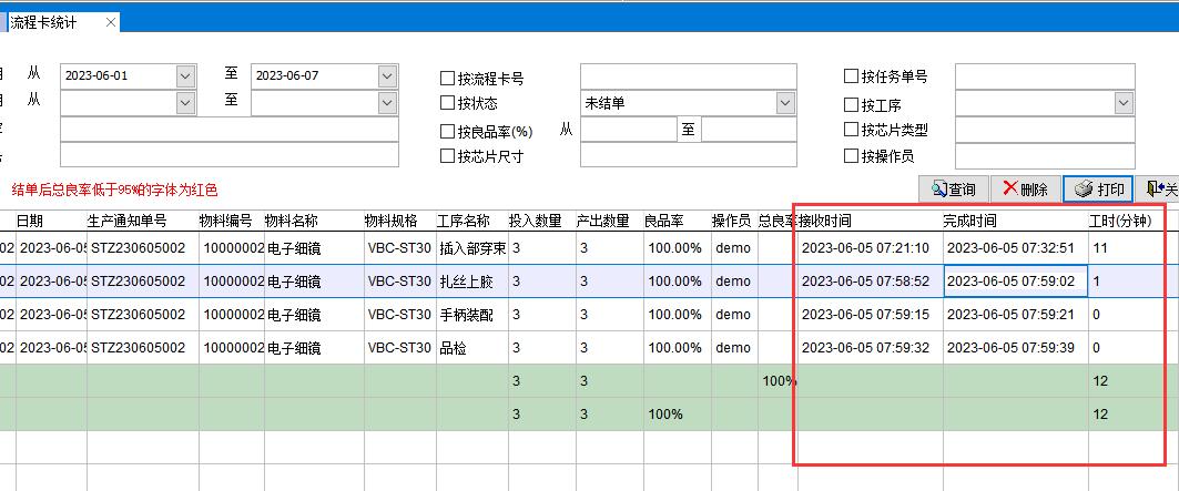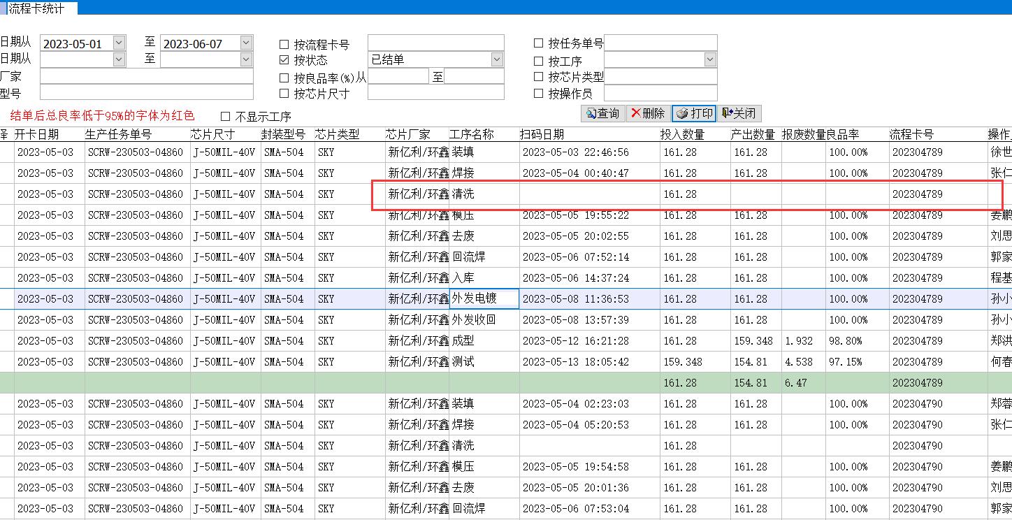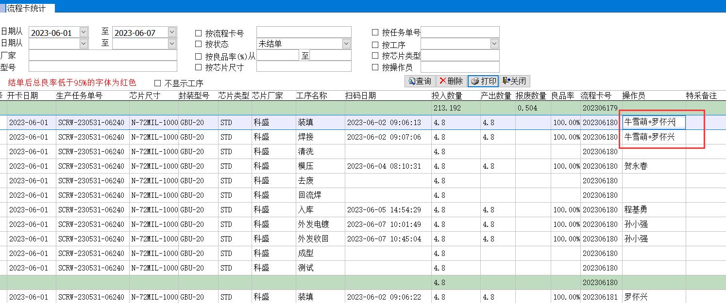 假設這樣一種場景:這道工序數(shù)量100件,生產人員完成一半時下班了,下個班組繼續(xù)完成剩下的一半,就存在多個人完成同一道工序的情況,掃碼完成后的結果如下