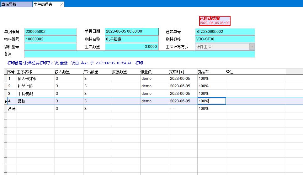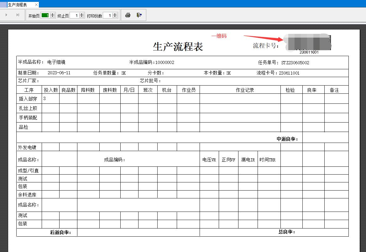 生產流程表就是根據每個產品的工藝路線,疊加上生產數量,并自動生成一個一維碼,打印生產流程表,后續每道工序根據條碼掃碼完成生產工序報工作業。
