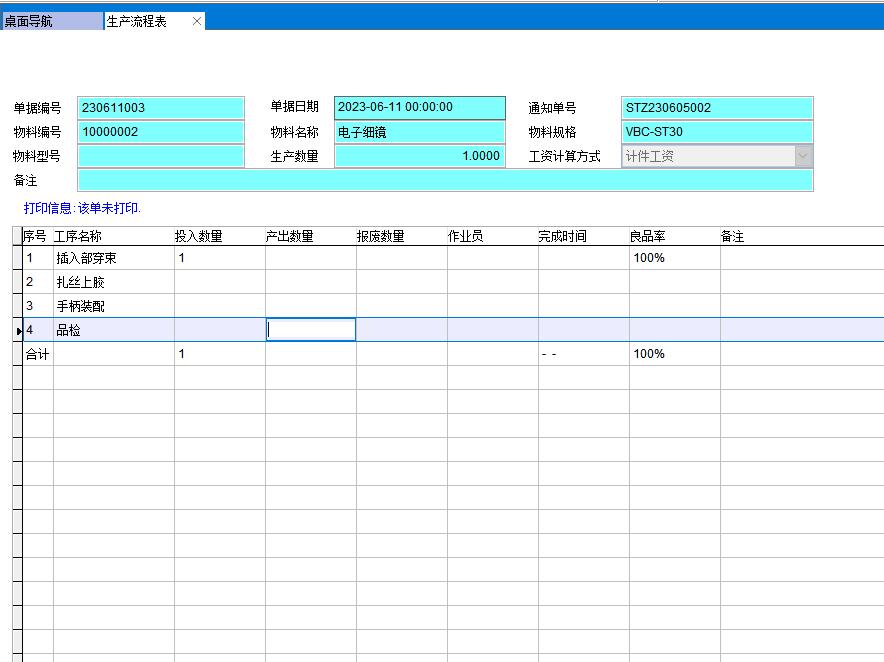 配置文件設置后再生成生產流程表如下圖,投入數量就是1