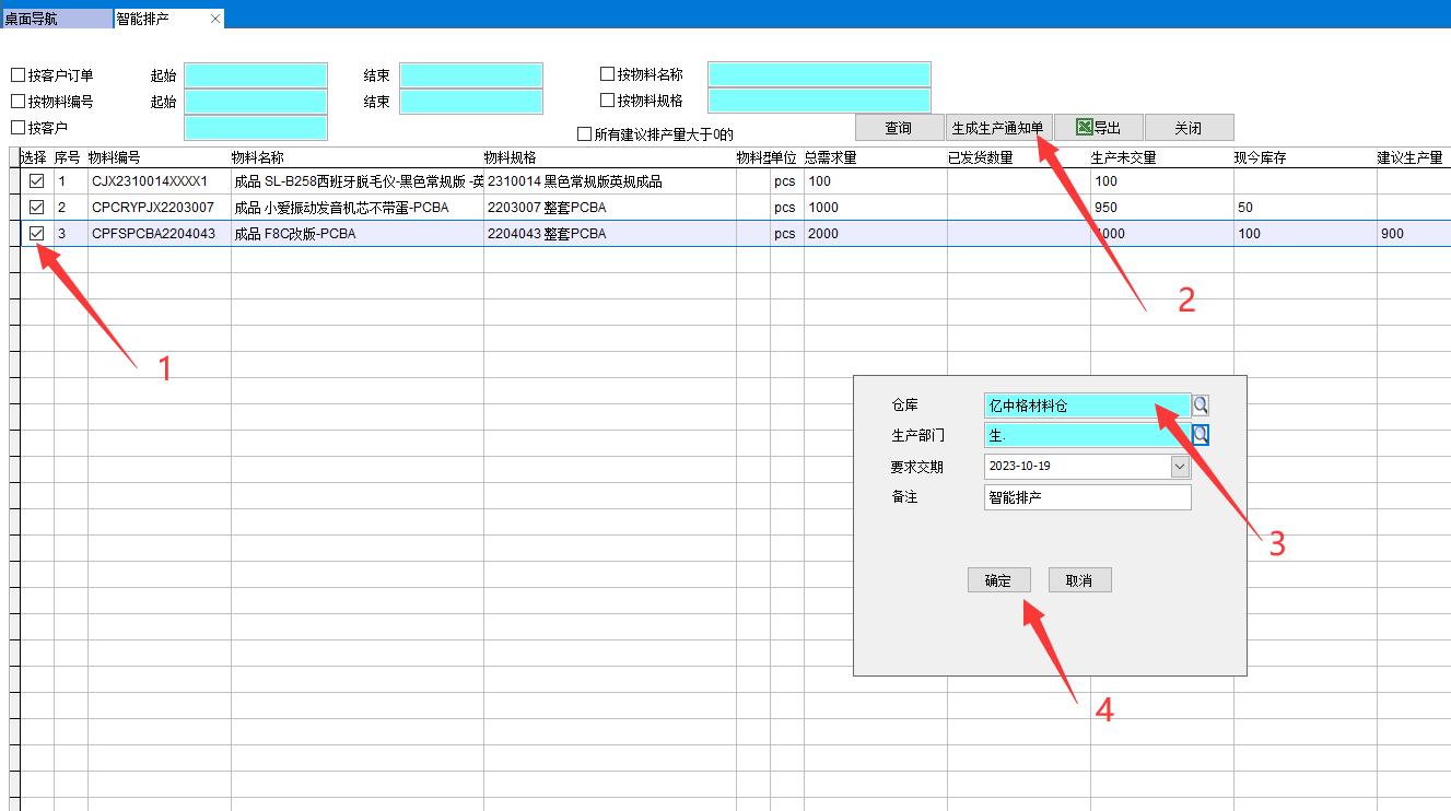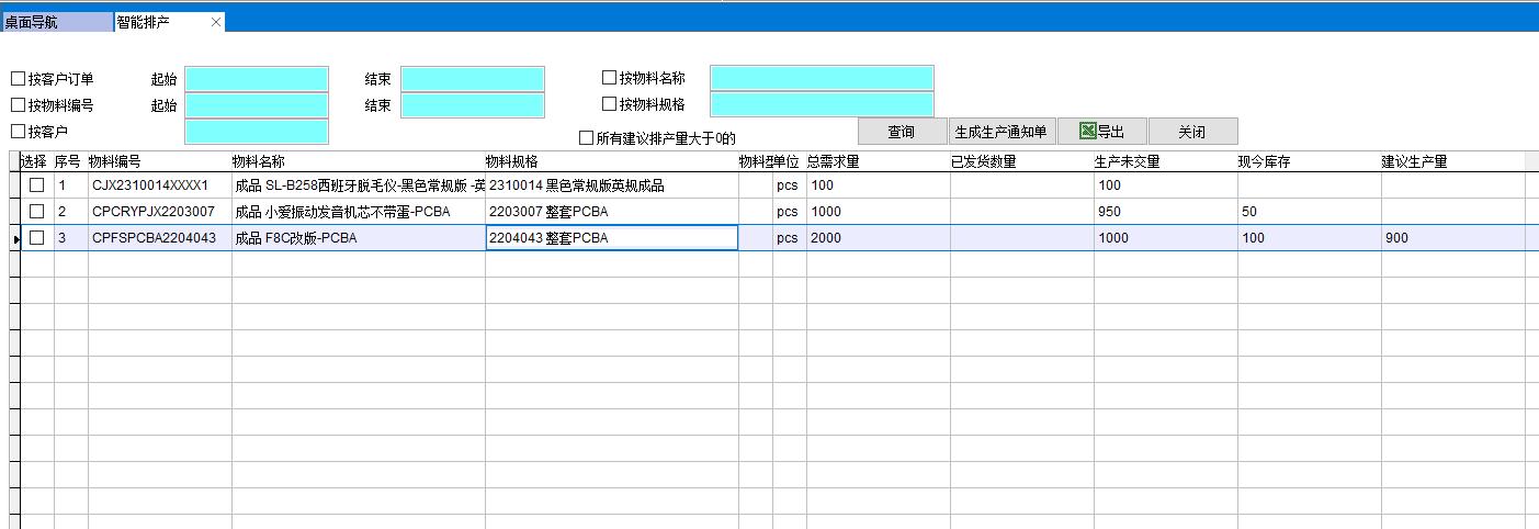 智能排產就是將所有訂單按產品進行同類合并作為總需求量,扣除已發貨量、生產未交量、庫存量后,產生建議生產量,點擊生產通知單即可完成生產計劃的下達。