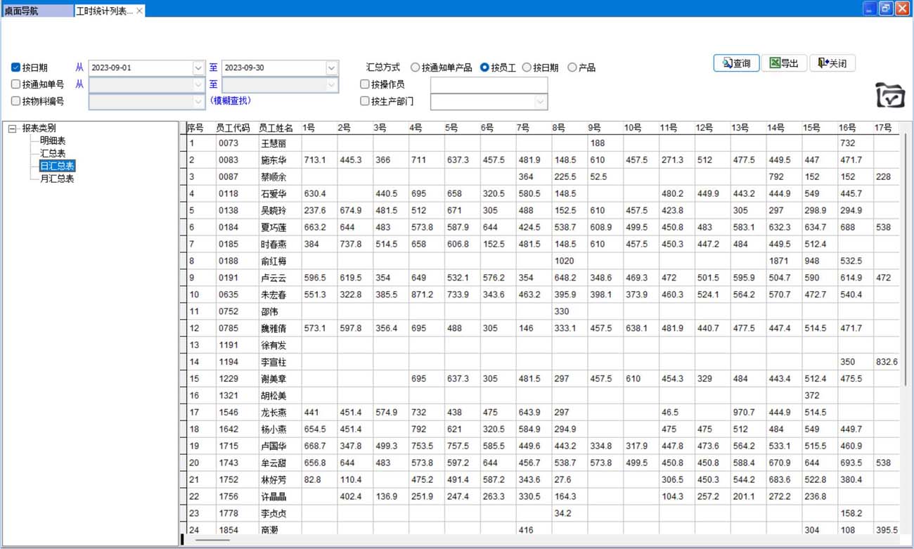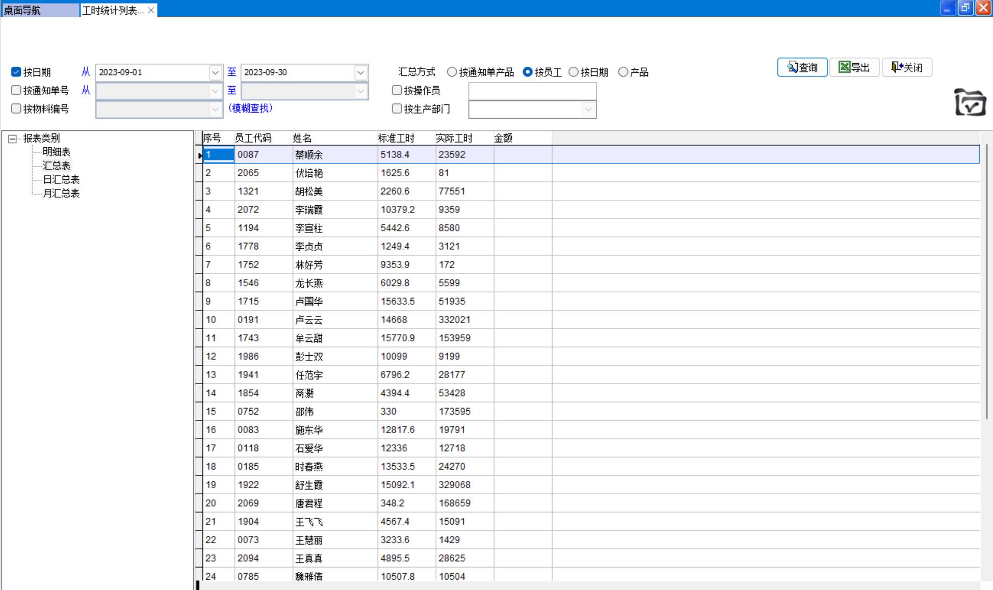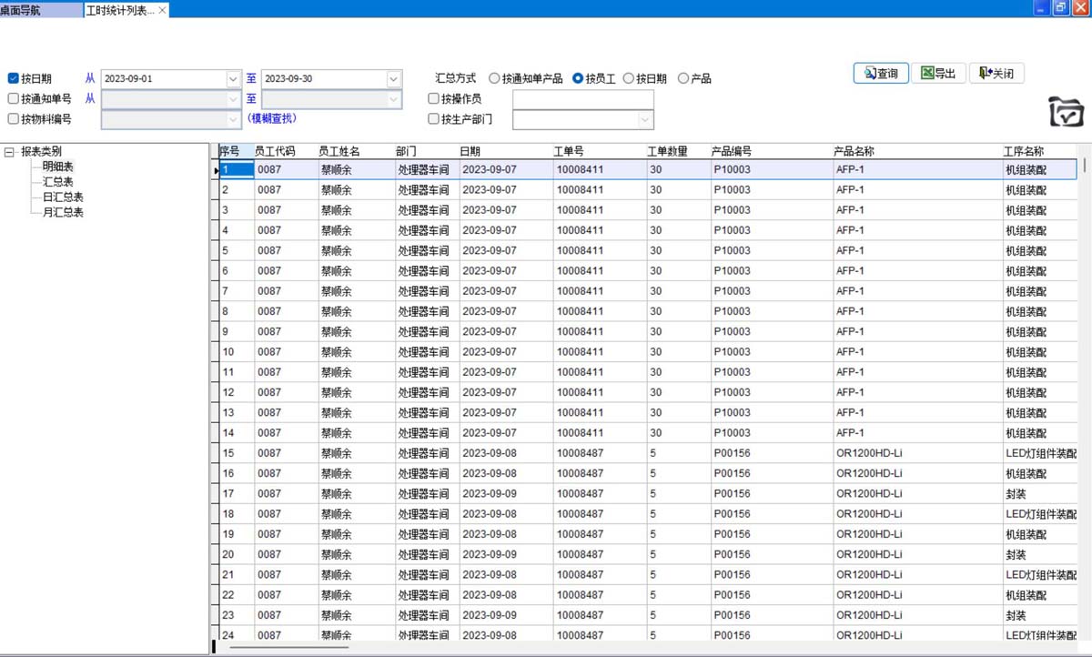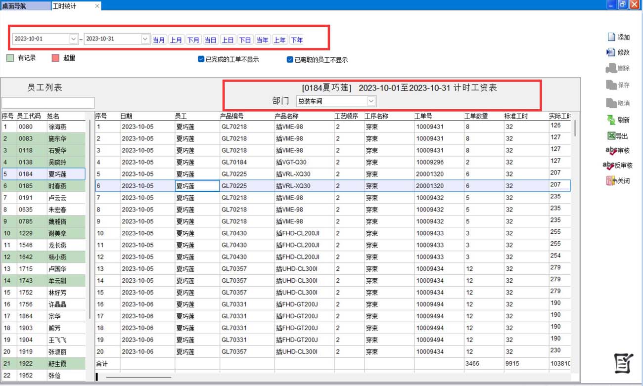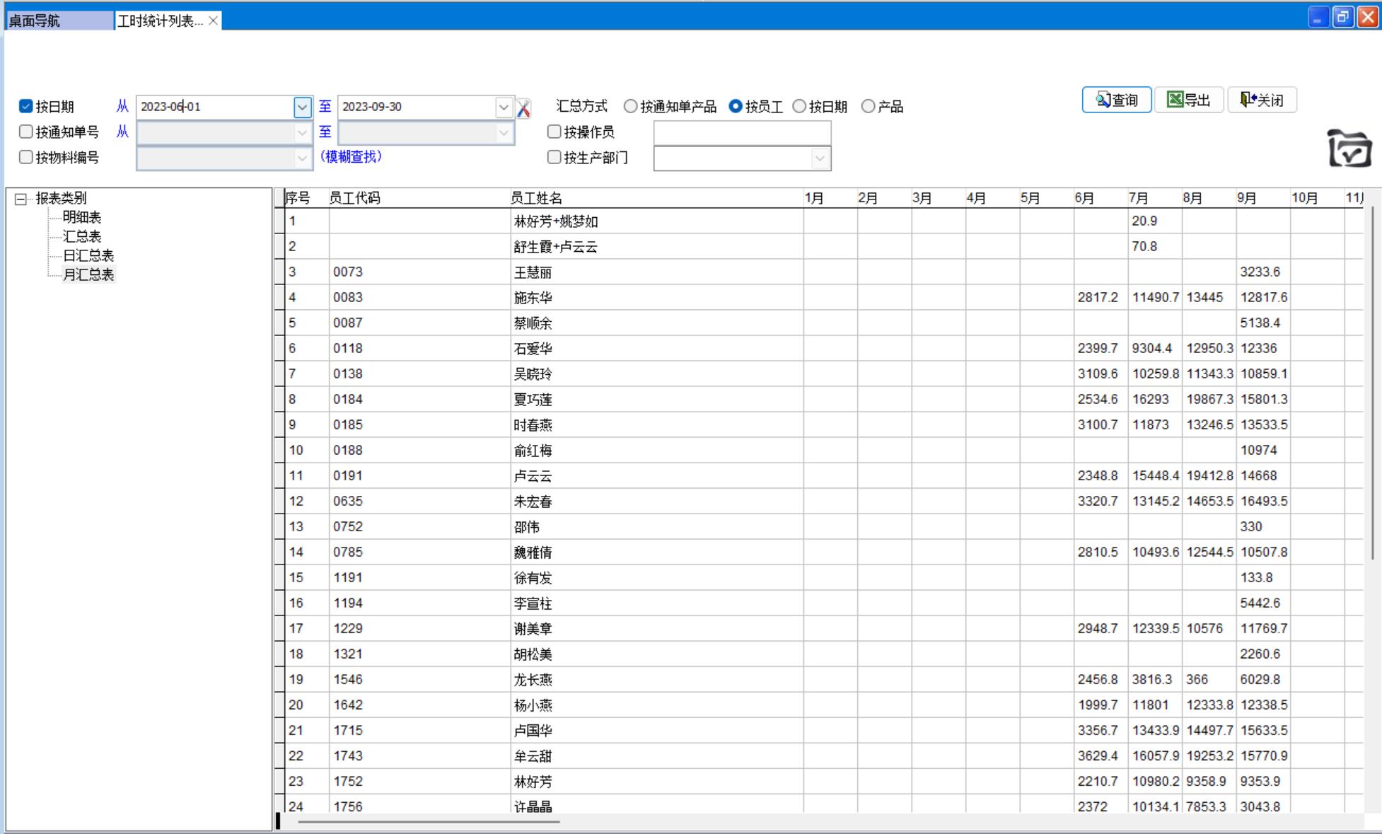 通常按月查詢工時,同時可以查看某個生產車間或員工的工時統計