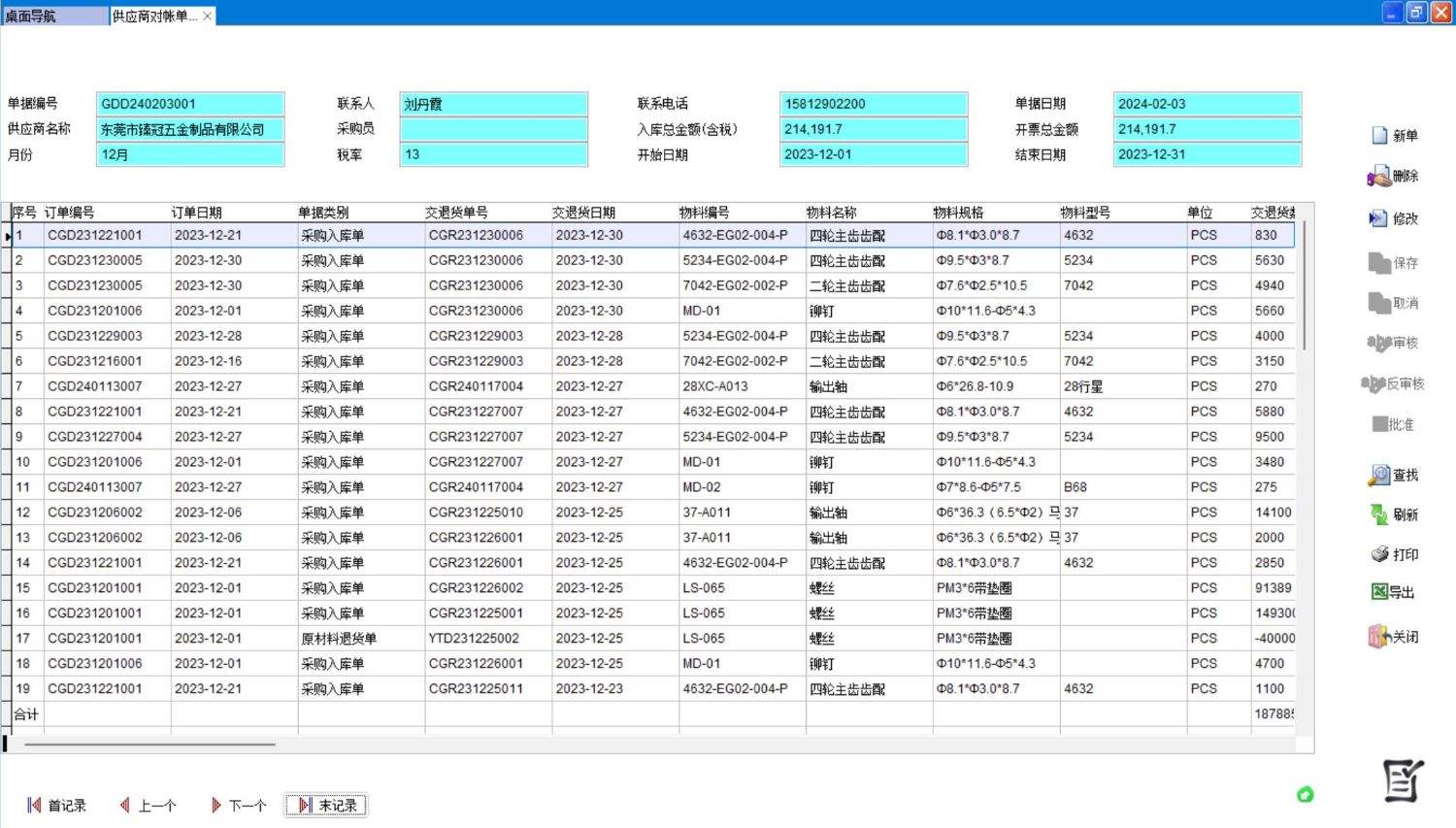 1、與供應商對賬,并保存對賬單。對賬單保存后相關單據不能再被修改