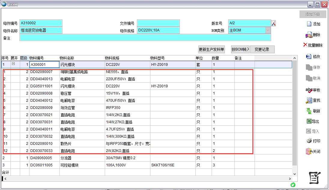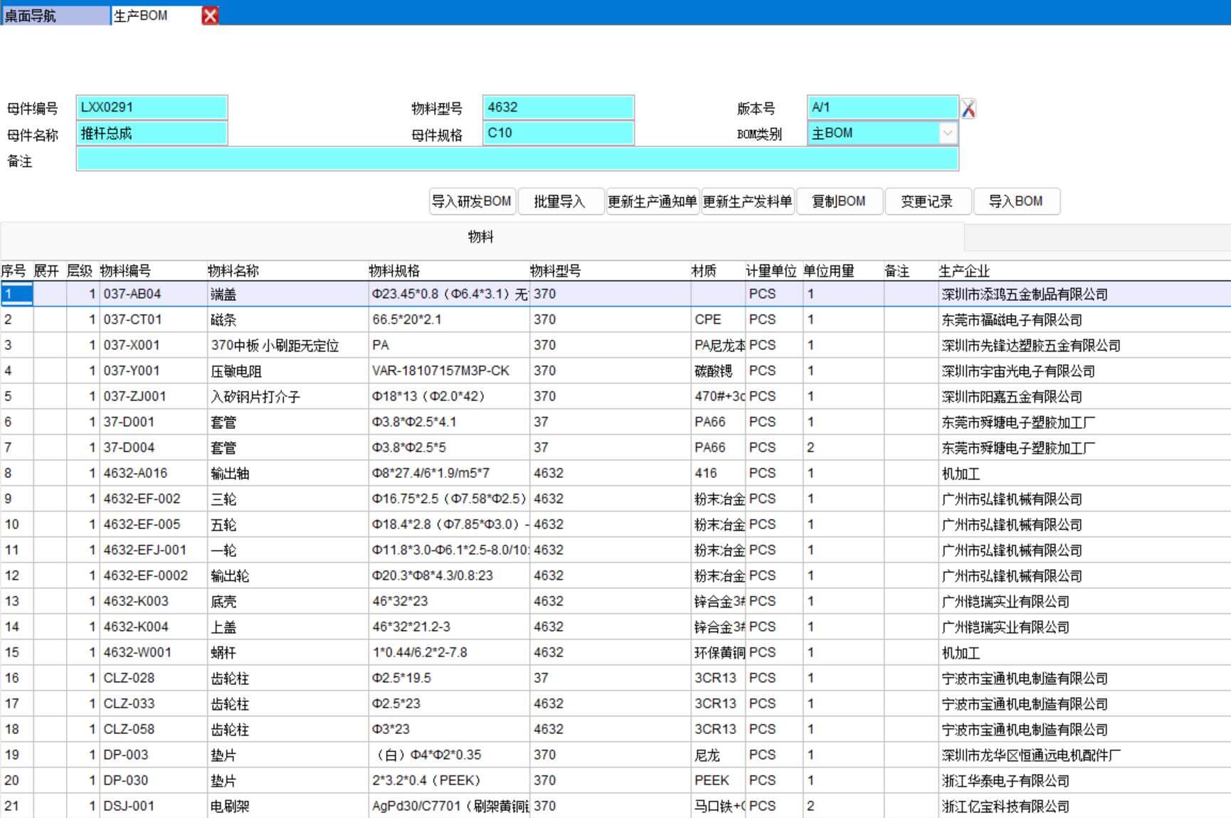 在ERP中,物料一詞有著廣泛的含義,它是所有產(chǎn)品,半成品,在制品,原材料,配套件,協(xié)作件,易耗品等等與生產(chǎn)有關(guān)的物料的統(tǒng)稱。BOM是指由雙親件及子件所組成的關(guān)系樹。BOM可以是自頂向下分解的形式或是以自底向上跟蹤的形式提供信息。在ERP系統(tǒng)中中BOM是一種數(shù)據(jù)之間的組織關(guān)系,利用這些數(shù)據(jù)之間層次關(guān)系可以作為很多功能模塊設(shè)計的基礎(chǔ),這些數(shù)據(jù)的某些表現(xiàn)形式是我們大家感到熟悉的匯總報表。BOM有什么作用?BOM是ERP最重要的基礎(chǔ)數(shù)據(jù),其組織格式設(shè)計和合理與否直接影響到系統(tǒng)的處理性能,因此,根據(jù)實際的使用環(huán)境,靈活地設(shè)計合理且有效的BOM是十分重要的。BOM不僅是重要的輸入數(shù)據(jù),而且是財務(wù)部門核算成本,制造部門組織生產(chǎn)等的重要依據(jù),因此,BOM的影響面最大,對它的準(zhǔn)確性要求也最高。正確地使用與維護(hù)BOM是管理系統(tǒng)運行期間十分重要的工作。