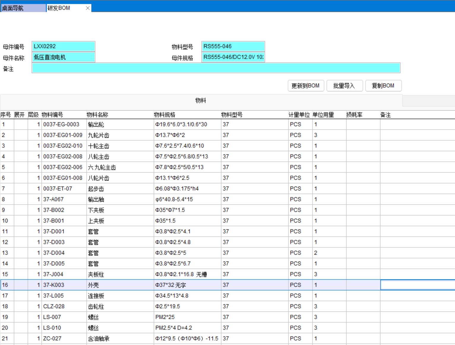 我們從最基本的講起什么是BOM,BOM就是組成產(chǎn)品的物料清單,比如產(chǎn)成品是汽車,那么汽車的BOM如下:發(fā)動機(jī)(1個)、地盤(1個)、車身(1個)、輪胎(4個)。。。,括號中是單個用量。為什么會有BOM存在呢?這是因為采用計算機(jī)輔助企業(yè)生產(chǎn)管理,首先要使計算機(jī)能夠讀出企業(yè)所制造的產(chǎn)品構(gòu)成和所有要涉及的物料,為了便于計算機(jī)識別,必須把用圖示表達(dá)的產(chǎn)品結(jié)構(gòu)轉(zhuǎn)化成某種數(shù)據(jù)格式,這種以數(shù)據(jù)格式來描述產(chǎn)品結(jié)構(gòu)的文件就是物料清單,即是BOM。它是定義產(chǎn)品結(jié)構(gòu)的技術(shù)文件,因此,它又稱為產(chǎn)品結(jié)構(gòu)表或產(chǎn)品結(jié)構(gòu)樹。在某些工業(yè)領(lǐng)域,可能稱為“配方”、“要素表”或其它名稱。