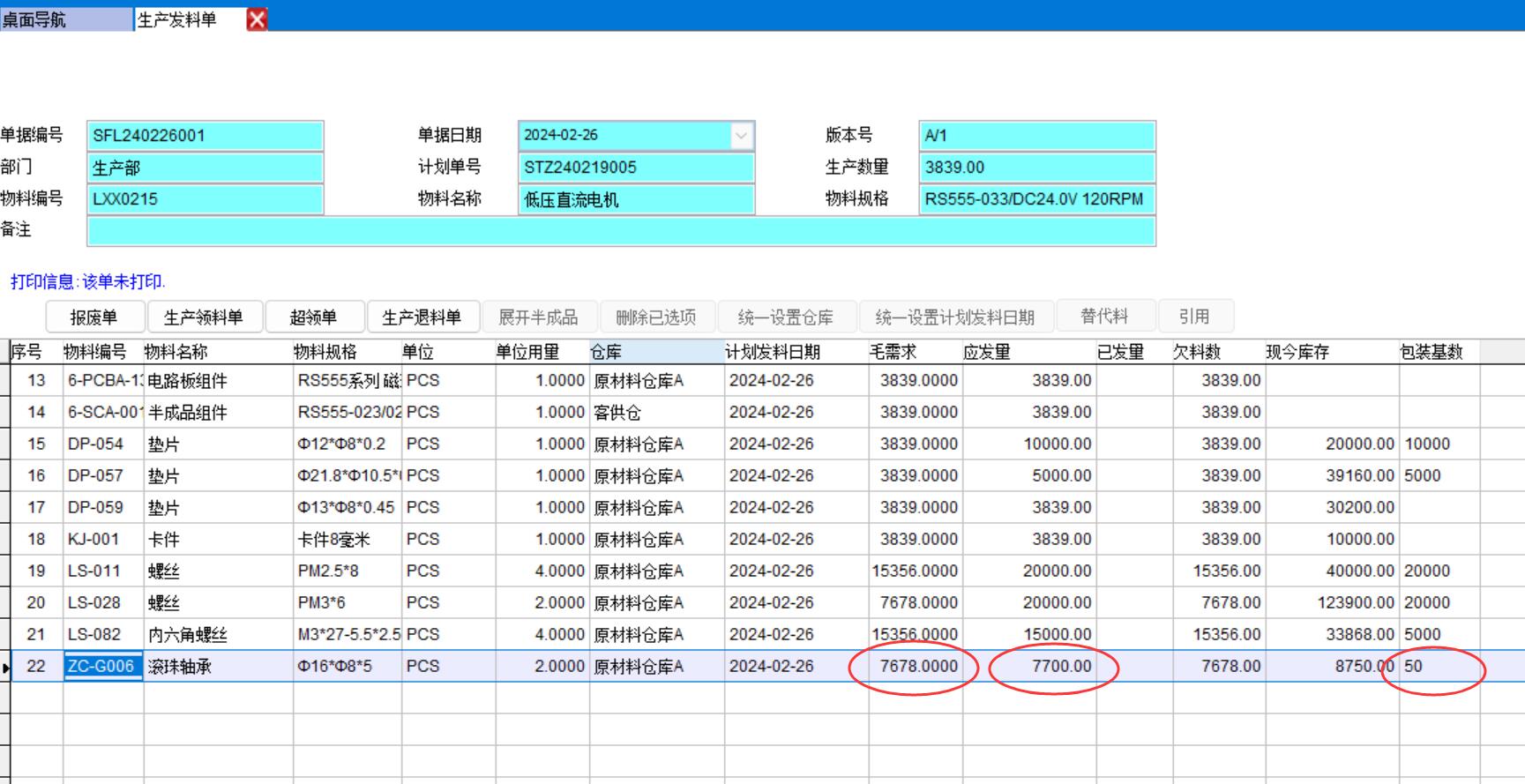生產實際需求數量是7678個,但是系統會按50的整數倍計算得出應發數量7700,倉庫實際發給車間7700個,剩余22個就在車間,系統在下個生產發料單時會先扣除這22個再計算還要給車間領多少料。