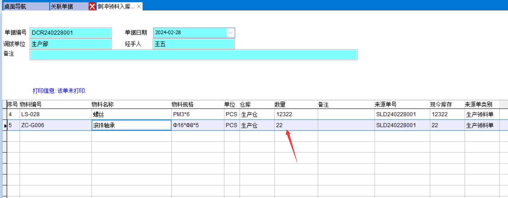 3、做生產領料單,從材料倉出庫7000個。同時生成倒沖入庫單將22個入到車間倉
