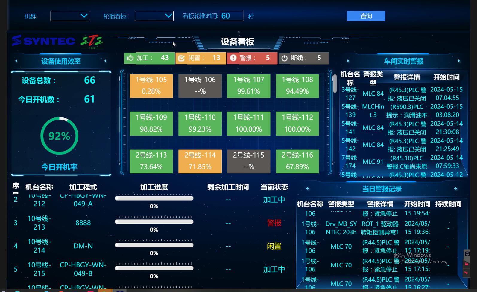 設(shè)備開(kāi)機(jī)率、設(shè)備稼動(dòng)率、設(shè)備報(bào)警記錄、當(dāng)前正在加工的程式。