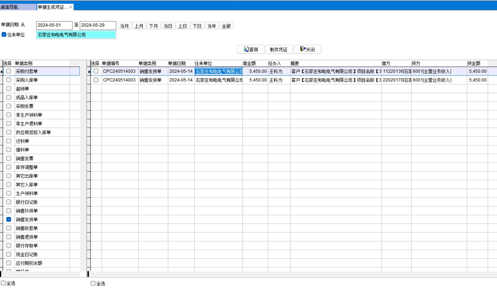單據生成憑證中只勾選銷售發貨單,點制作憑證即可