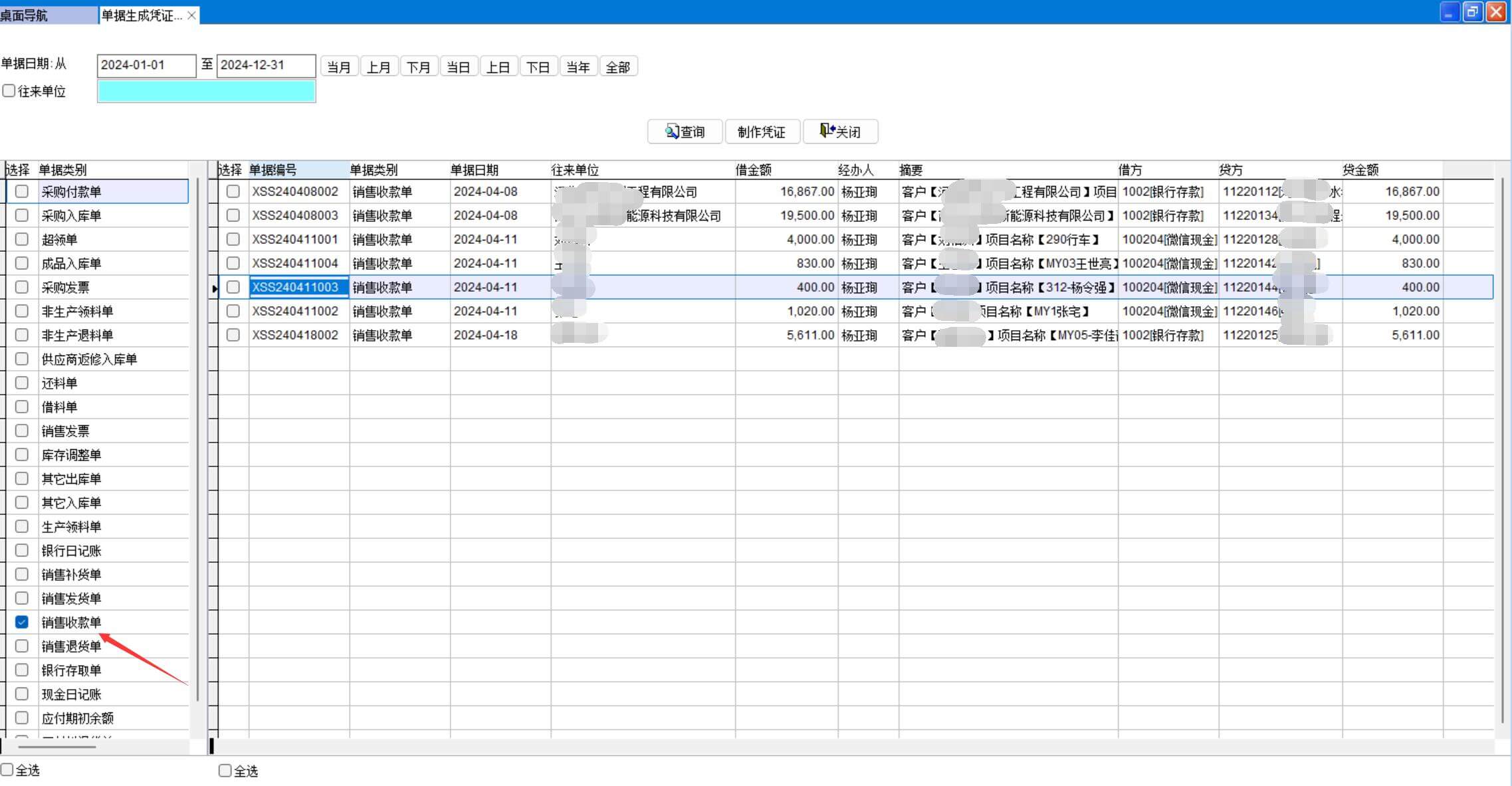單據(jù)生成憑證(總賬-憑證-單據(jù)生成憑證)中只勾選銷售收款單,點(diǎn)制作憑證即可