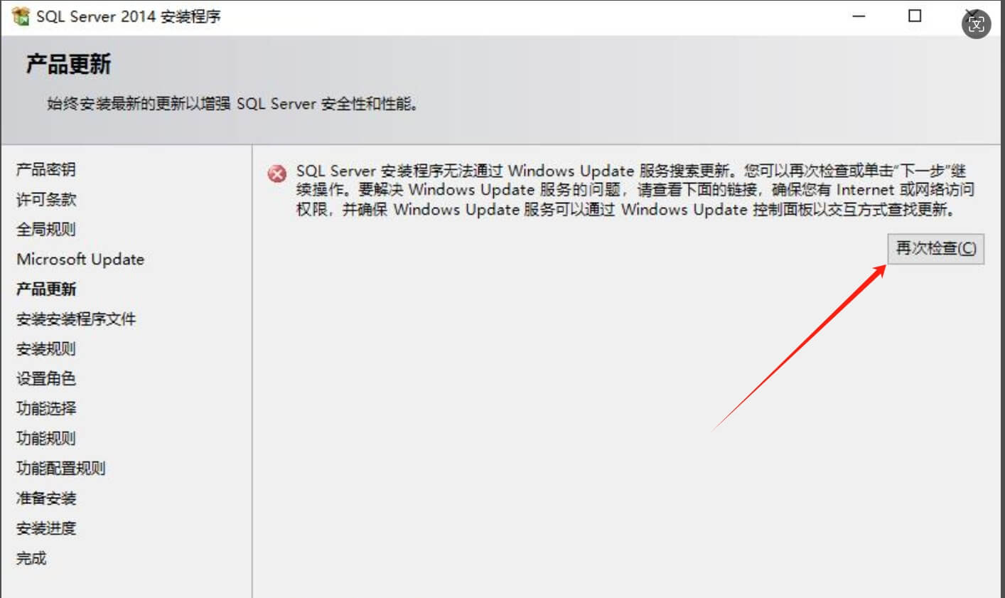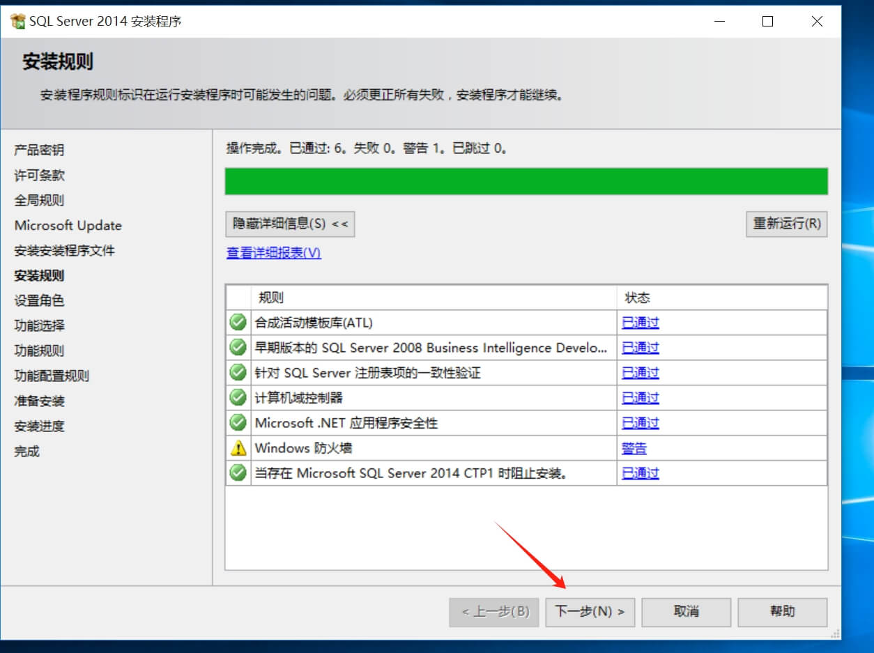 再回到SQL2014安裝界面,點重新檢查,此時錯誤警告已經消除了,點下一步