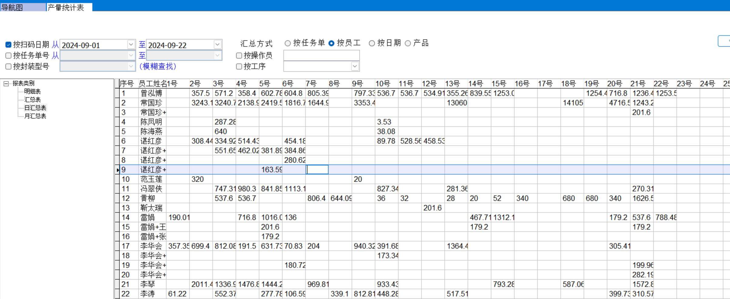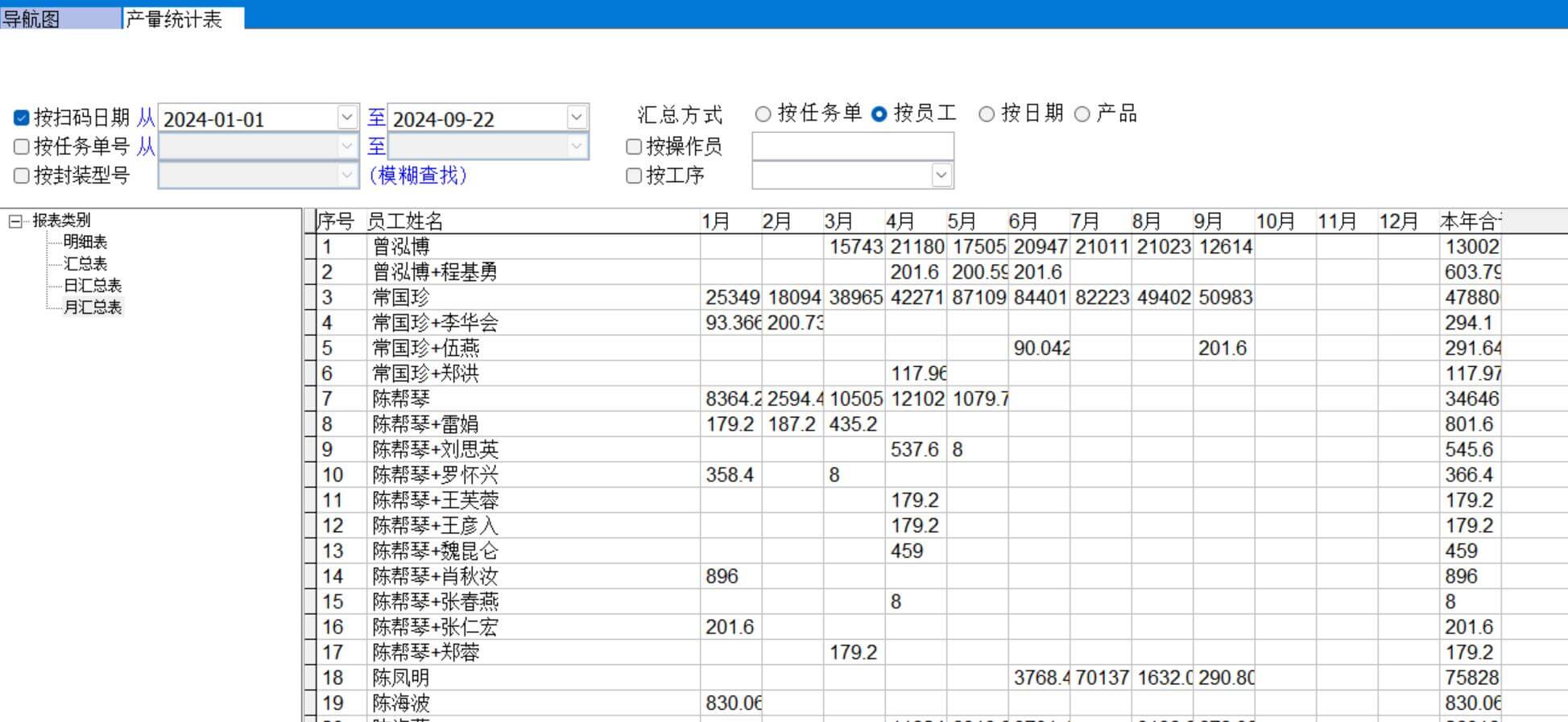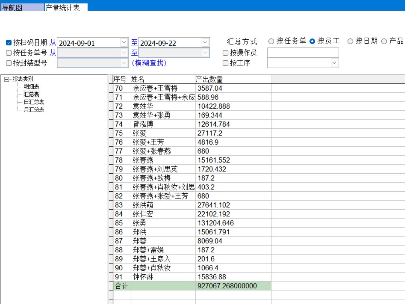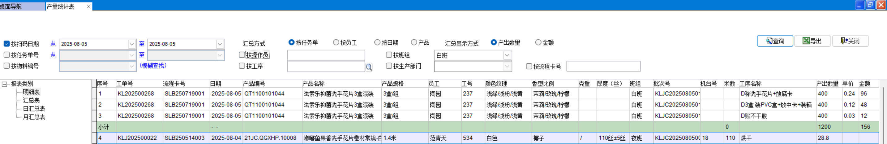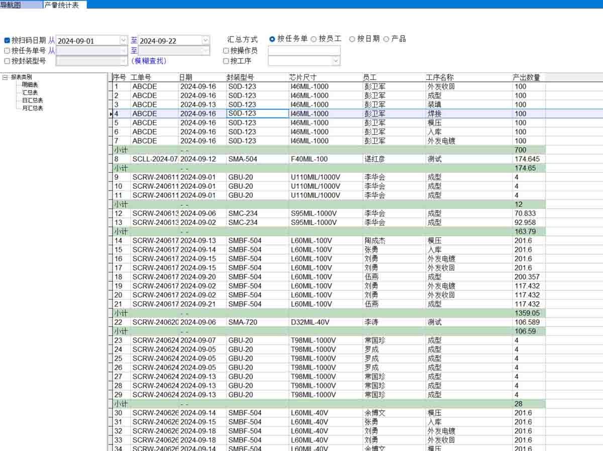 產(chǎn)量統(tǒng)計表可以按任務(wù)單、員工、日期、產(chǎn)品進(jìn)行匯總