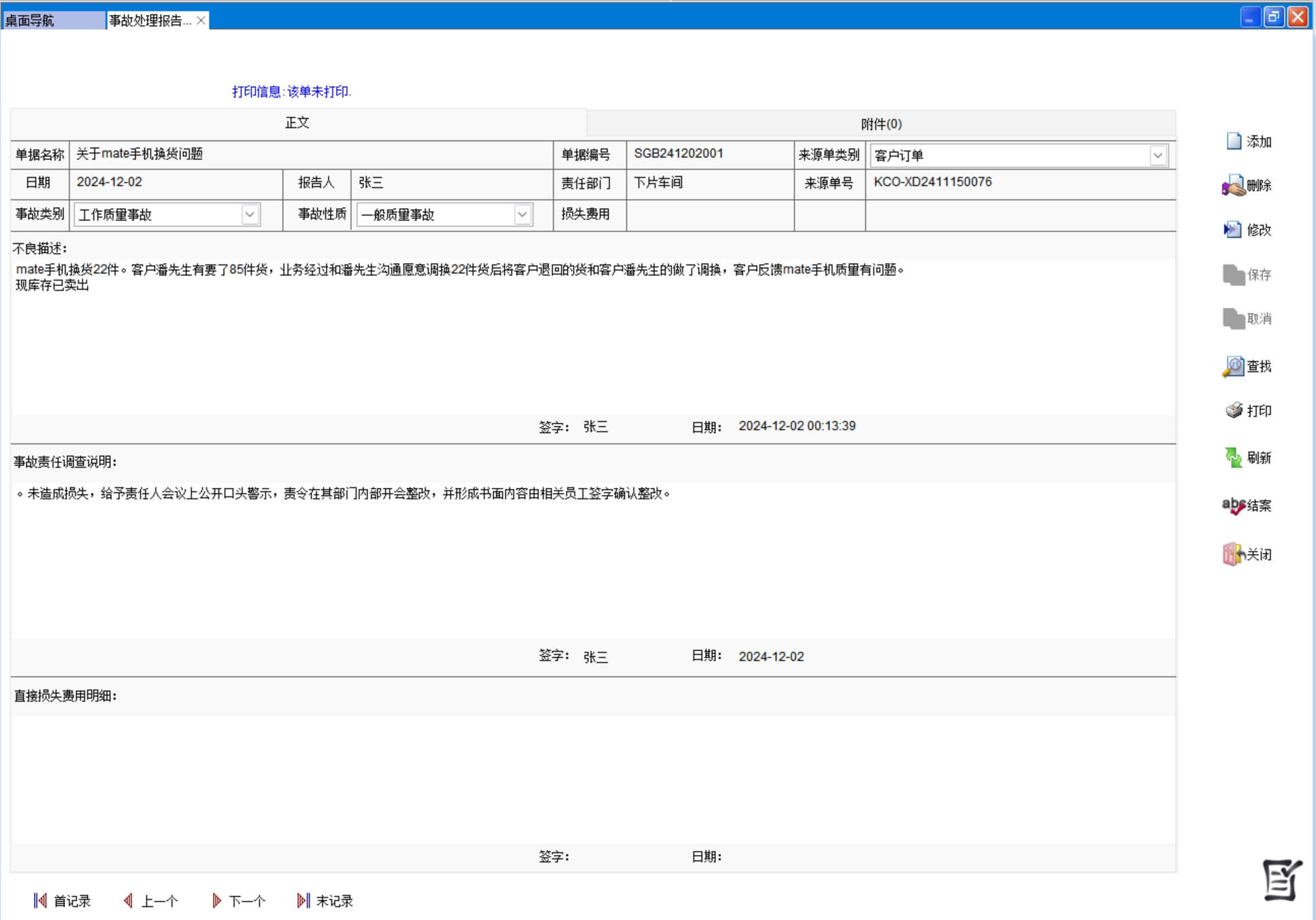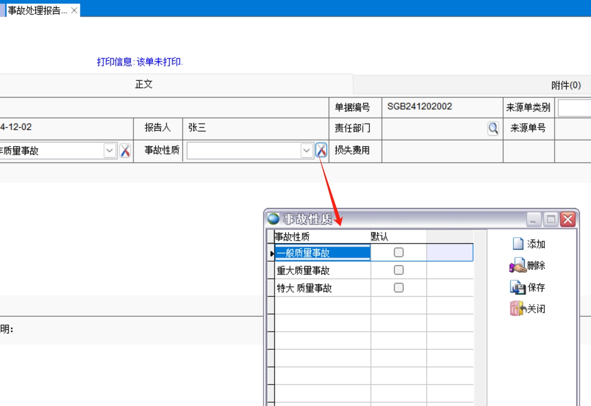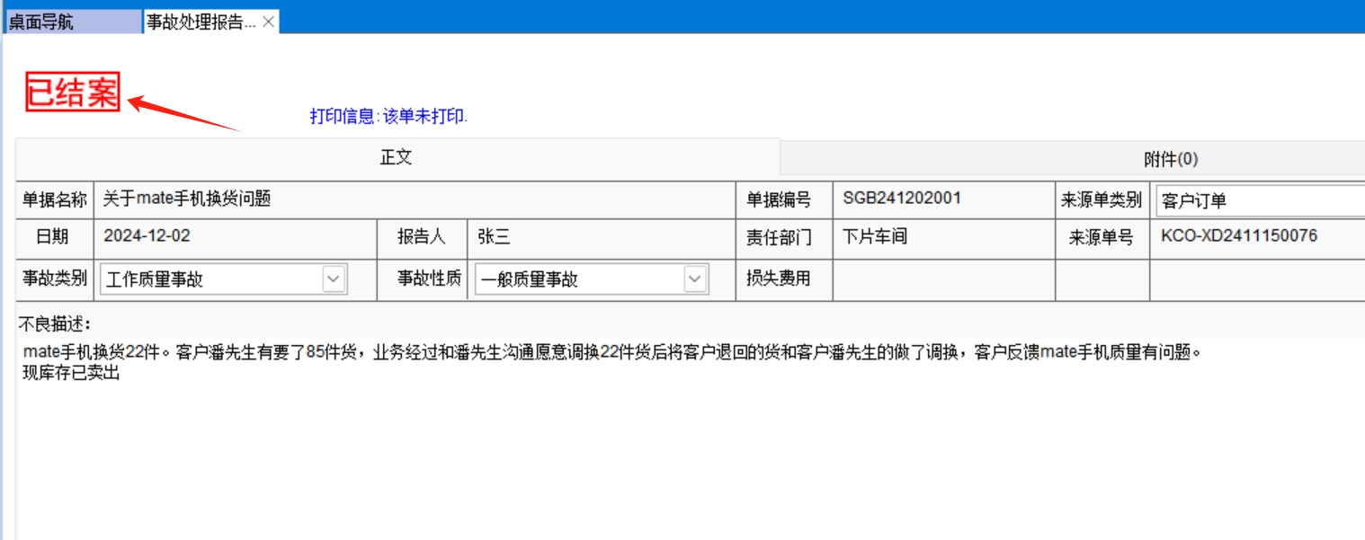 打開路徑:【主菜單】-【質量】-【事故處理報告】