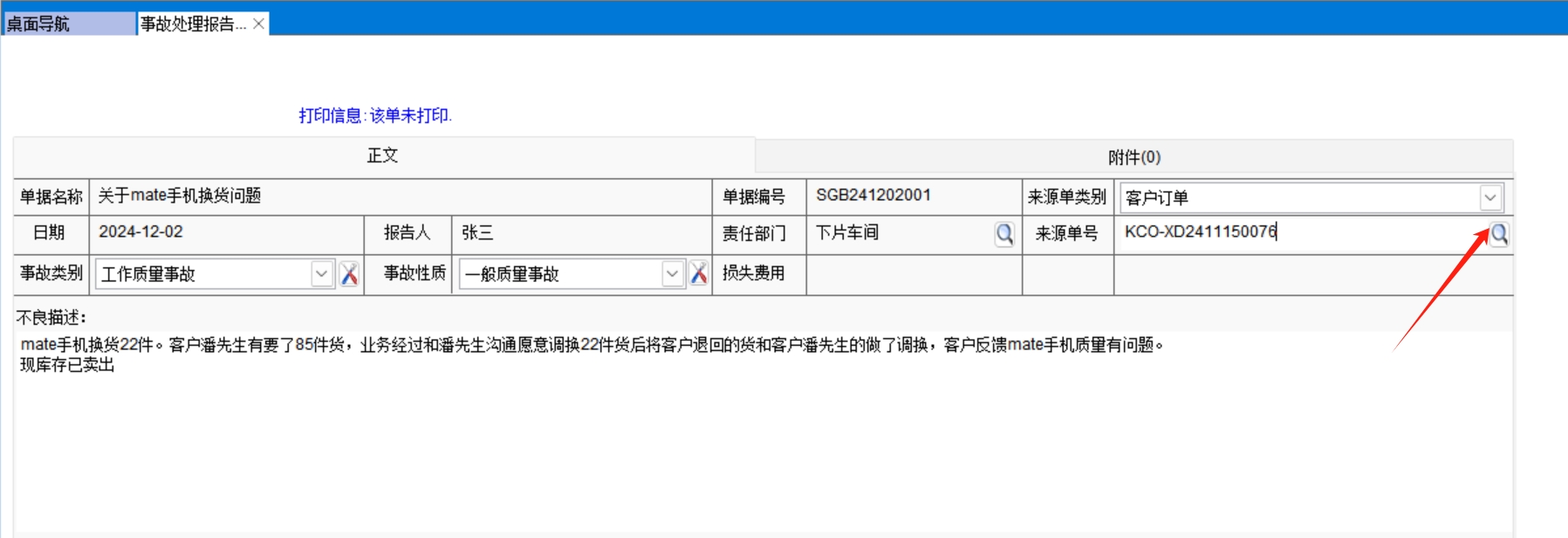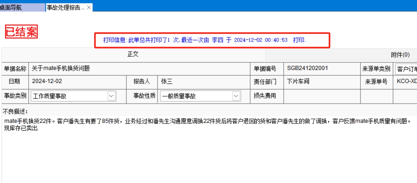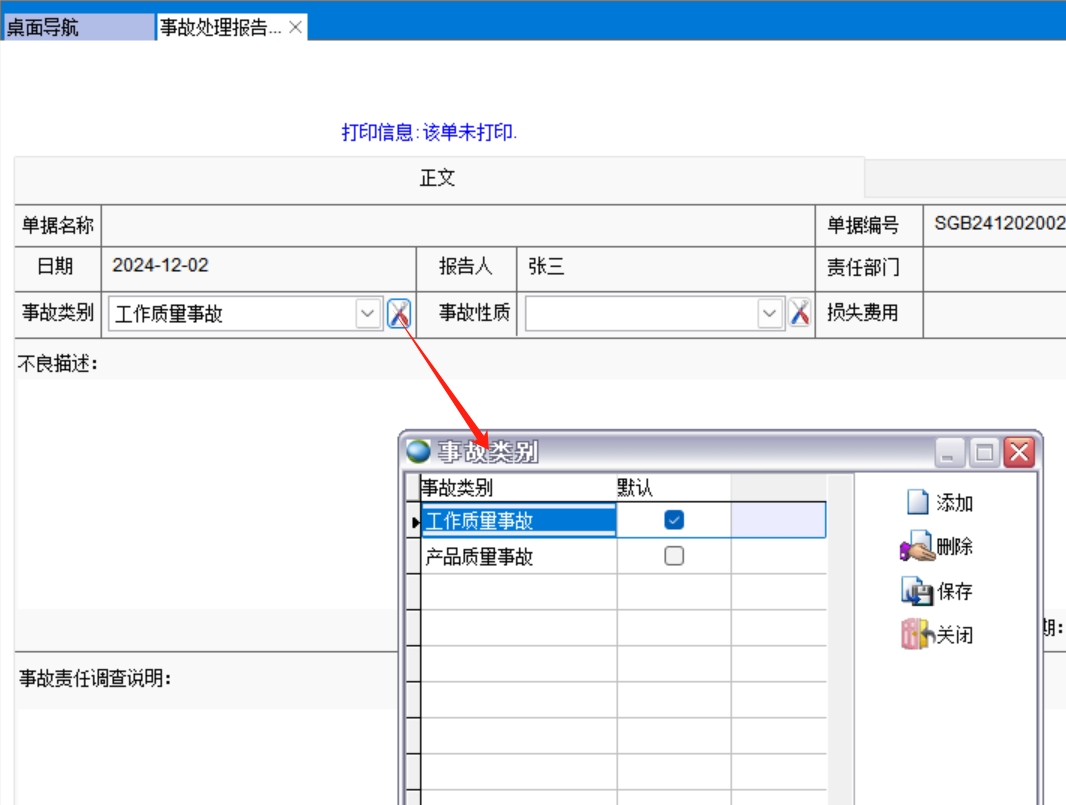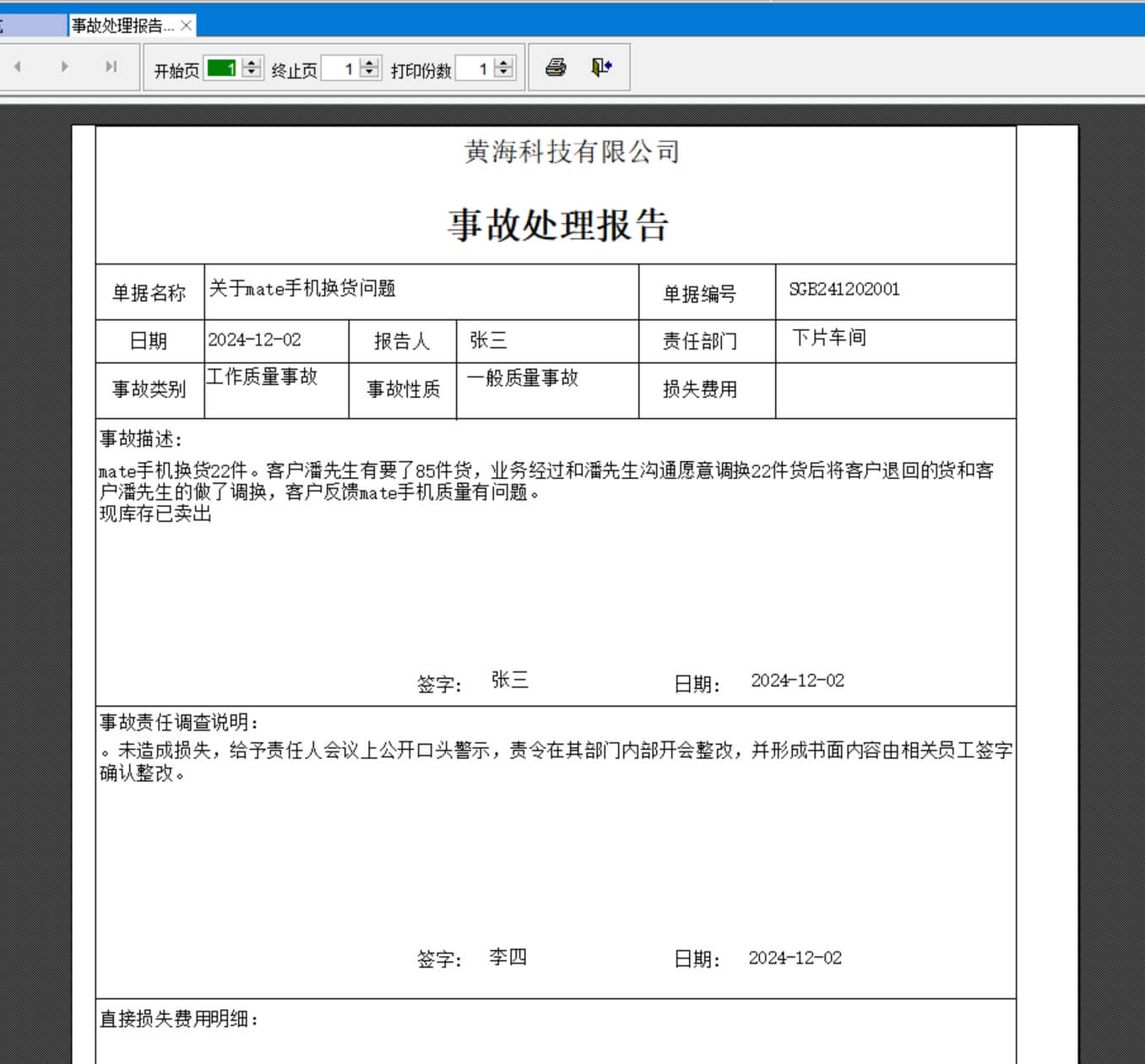打開路徑:【主菜單】-【質量】-【事故處理報告】