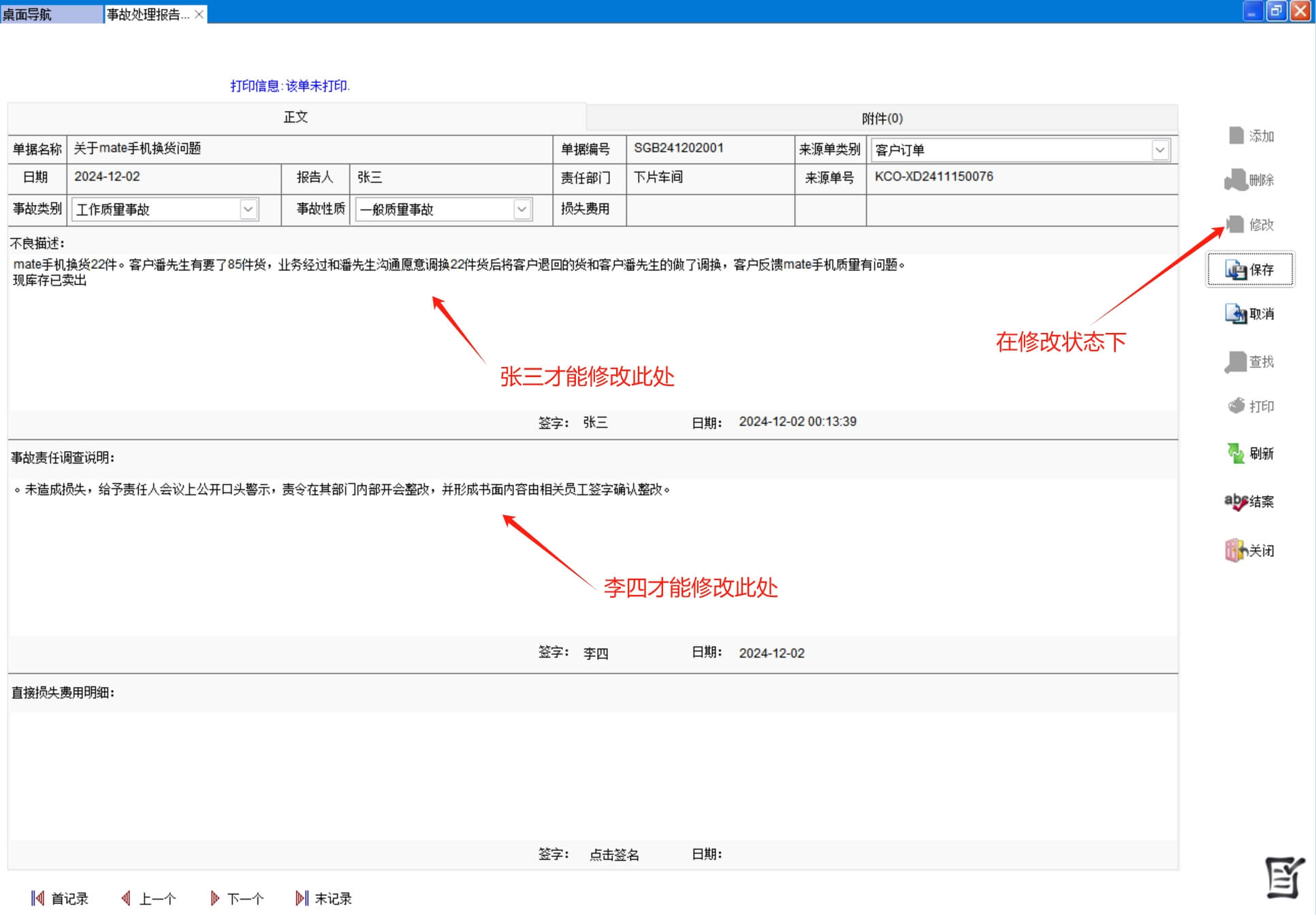 在修改狀態下,只有簽字的本人才能修改不良描述、事故責任調查說明、直接損失費用明細
