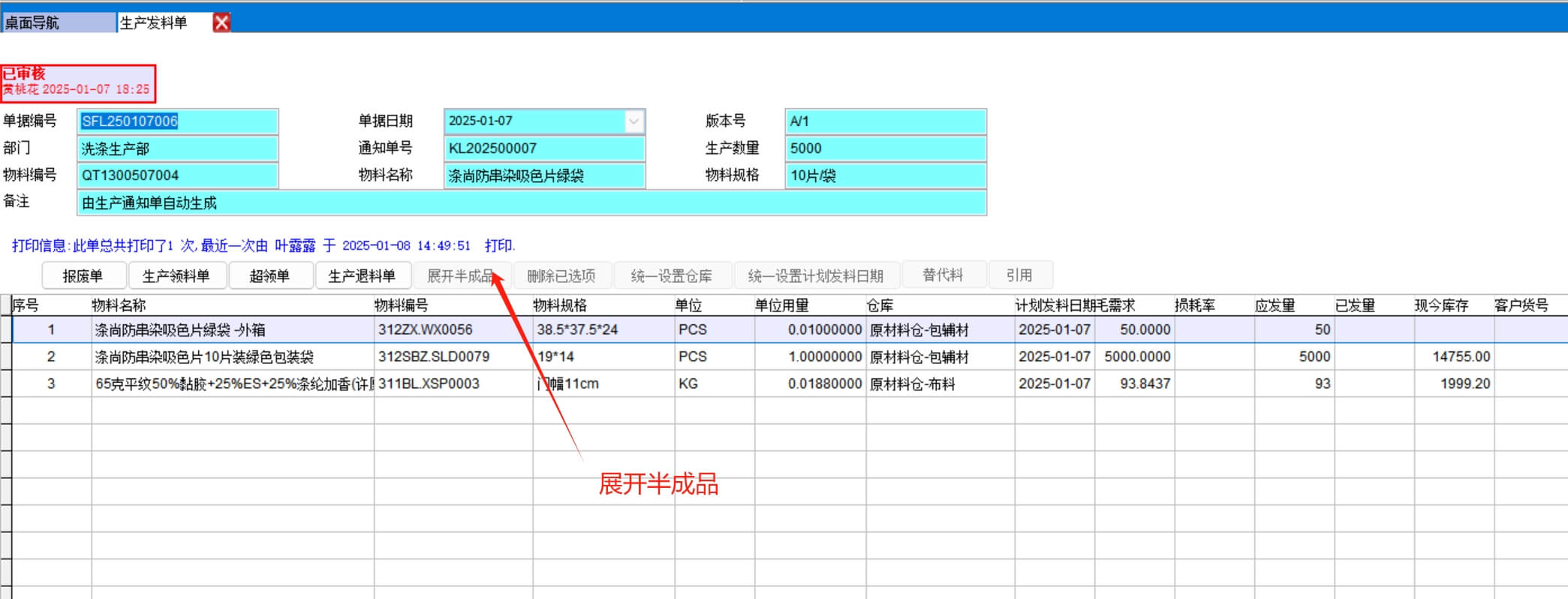 生產(chǎn)發(fā)料單是根據(jù)BOM展開材料的,如果是多層BOM可以通過點展開半成品向下展開下級BOM,可以多次點直到展開到最下層