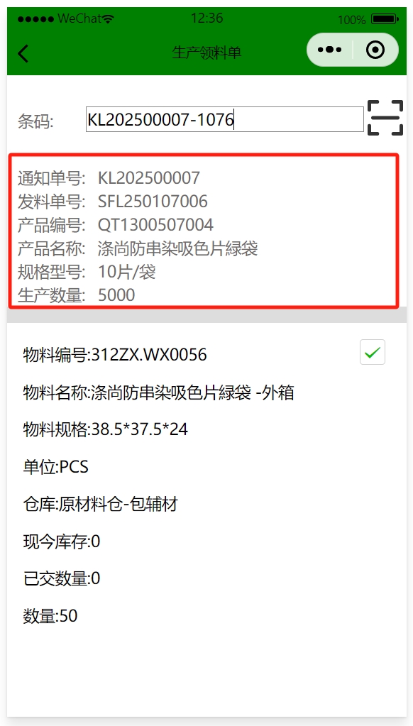 生產(chǎn)通知單包含條碼信息,手機掃該條碼完成領料