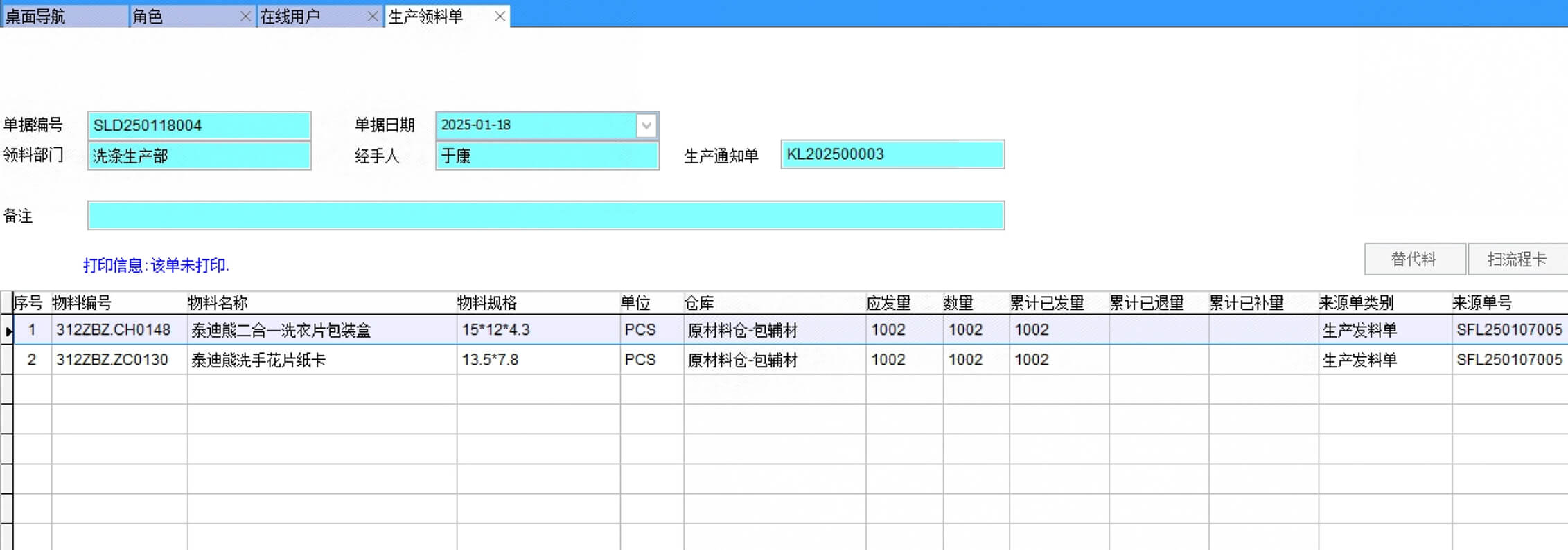 也會按生產(chǎn)發(fā)料單顯示所有材料信息,不需要出庫的材料把勾選項去掉