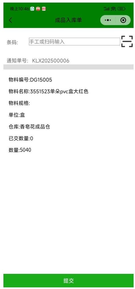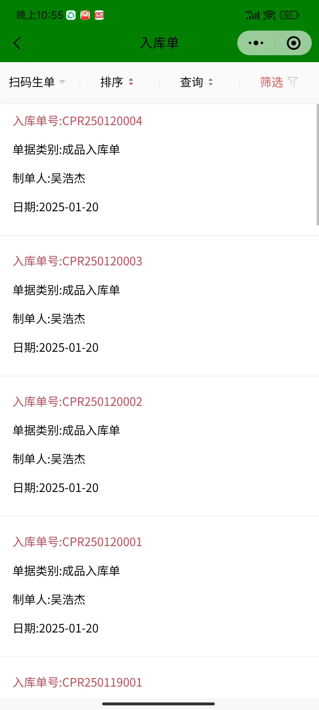 打開路徑:【首頁】-【工作臺】-【倉庫】-【入庫單】-【掃碼生單】-成品入庫單
