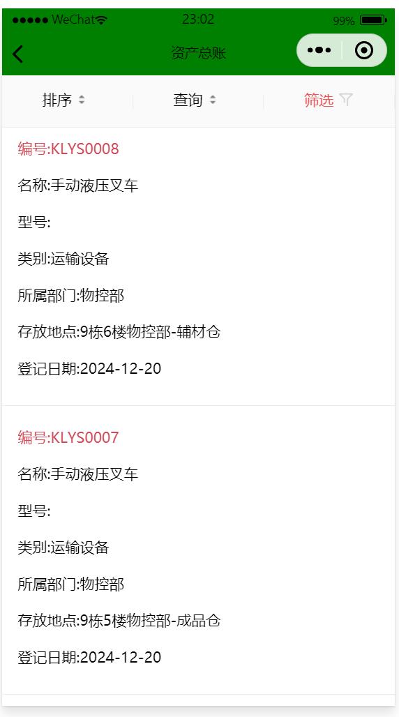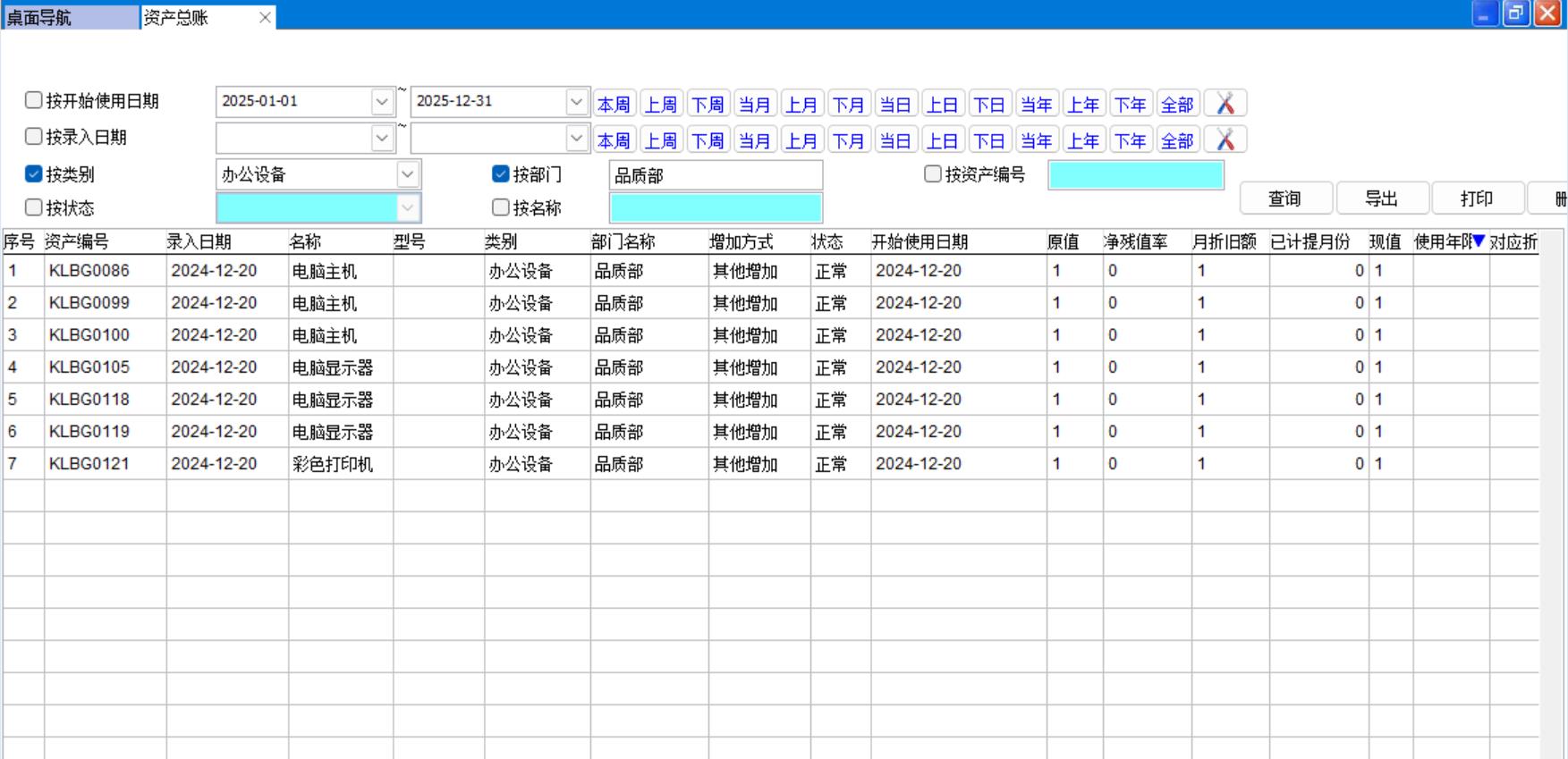 資產總賬可以通過類別、歸屬部門、狀態(正常、維修、報廢)、資產名稱、資產編號進行查詢。
