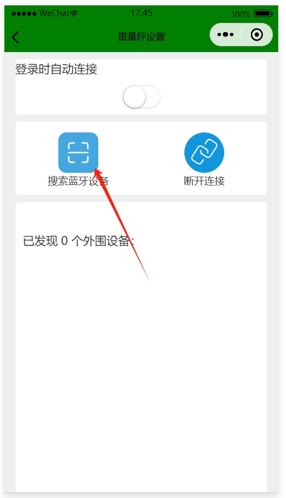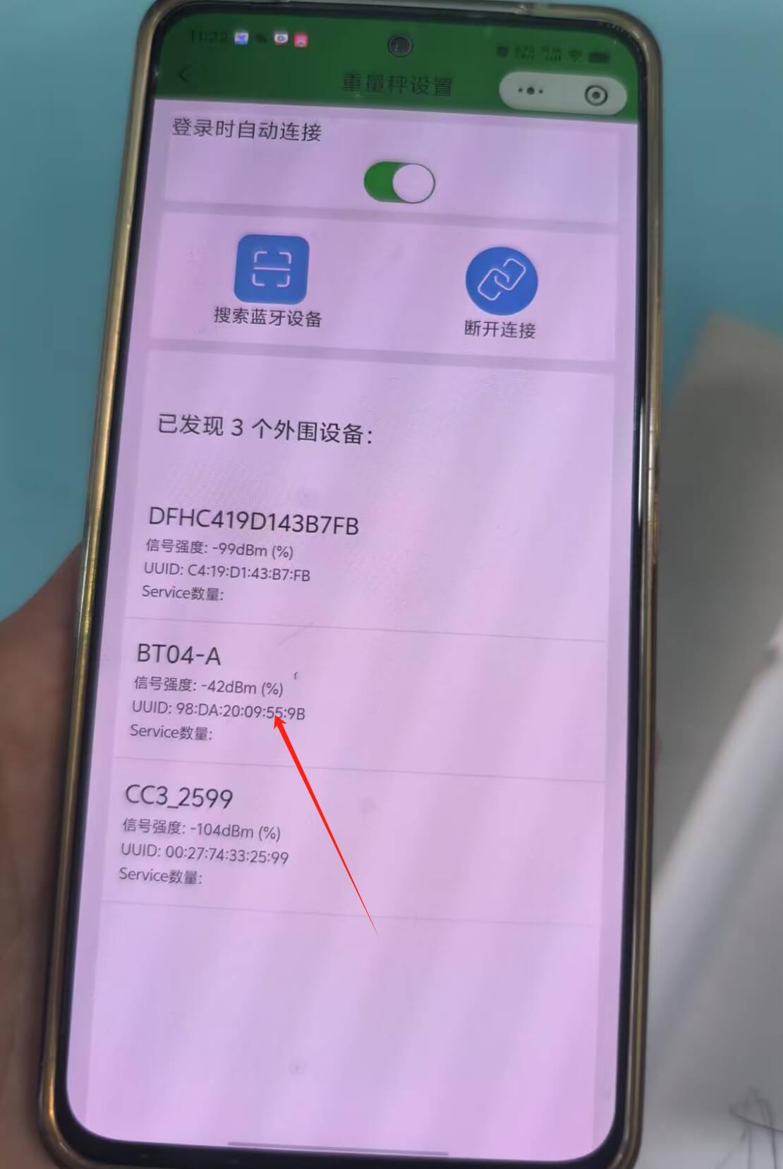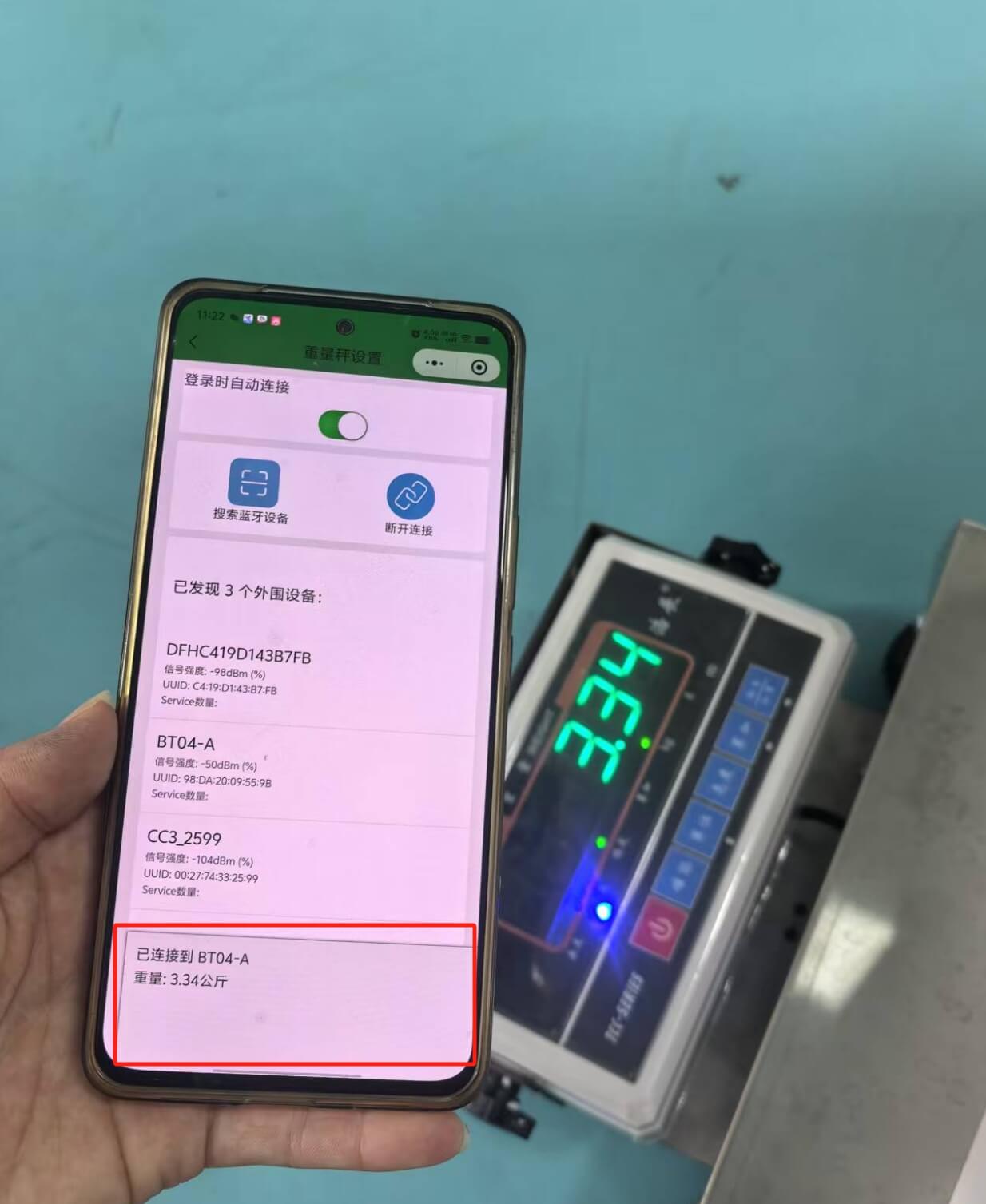 如果連接成功就會讀取到重量的數據,然后勾選登錄時自動連接,以后每次進入小程序都會自動重連。