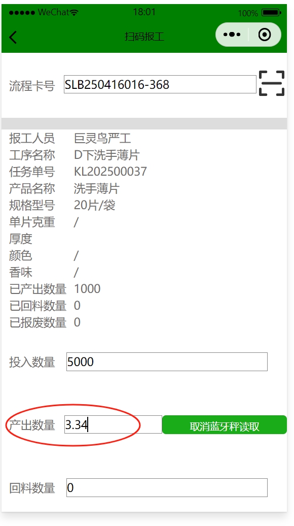 在掃碼報工時產出量就是自動獲取重量數據,手工無法修改,如果需要手工修改就點取消藍牙秤讀取