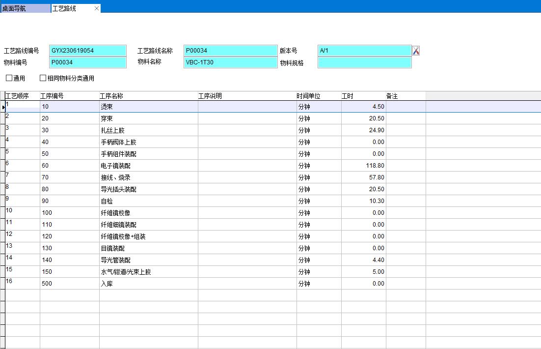 如果勾選了通用,那只要建一個(gè)工藝路線即可,所有產(chǎn)品都使用相同的工藝路線,否則每個(gè)產(chǎn)品建一個(gè)工藝路線