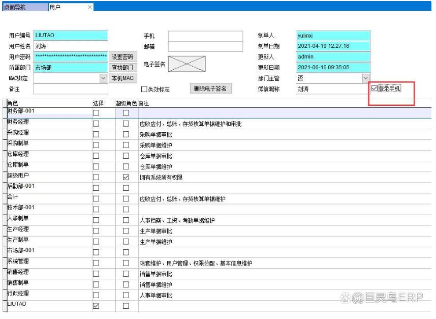 所有單據都可以設置權限,權限在電腦端設置,比如設置某用戶允許登錄手機端