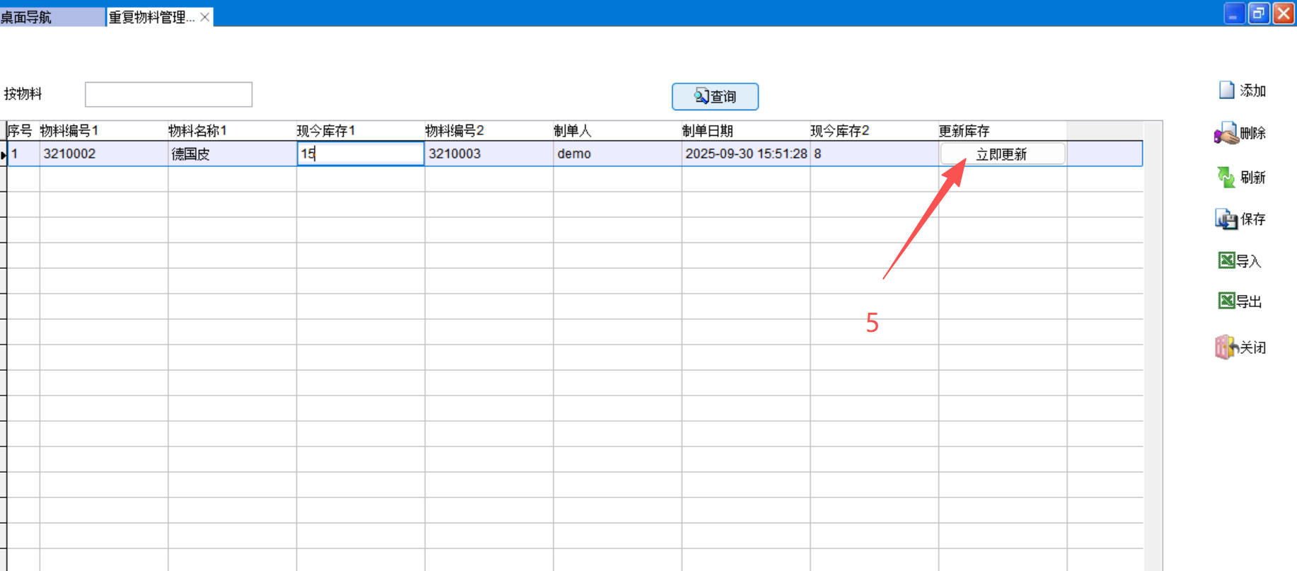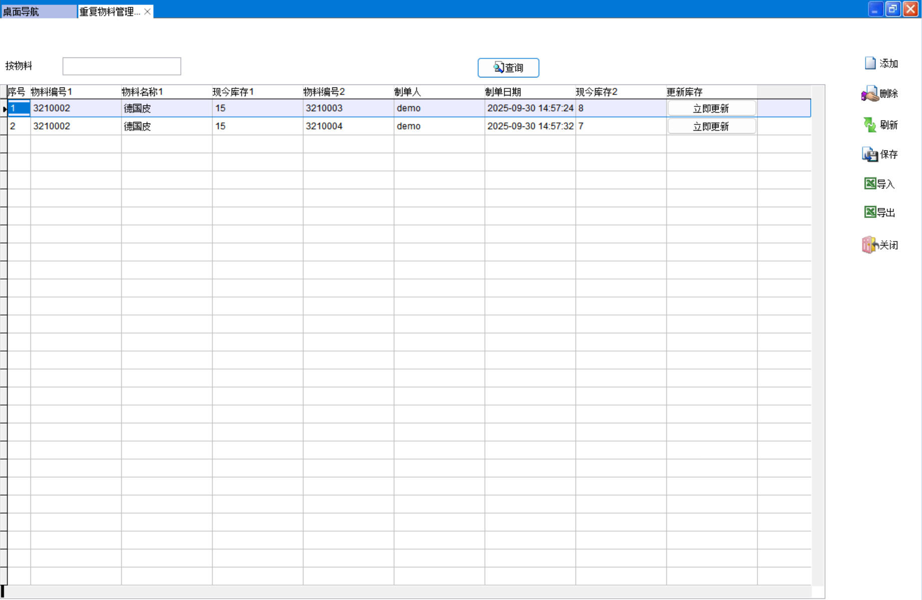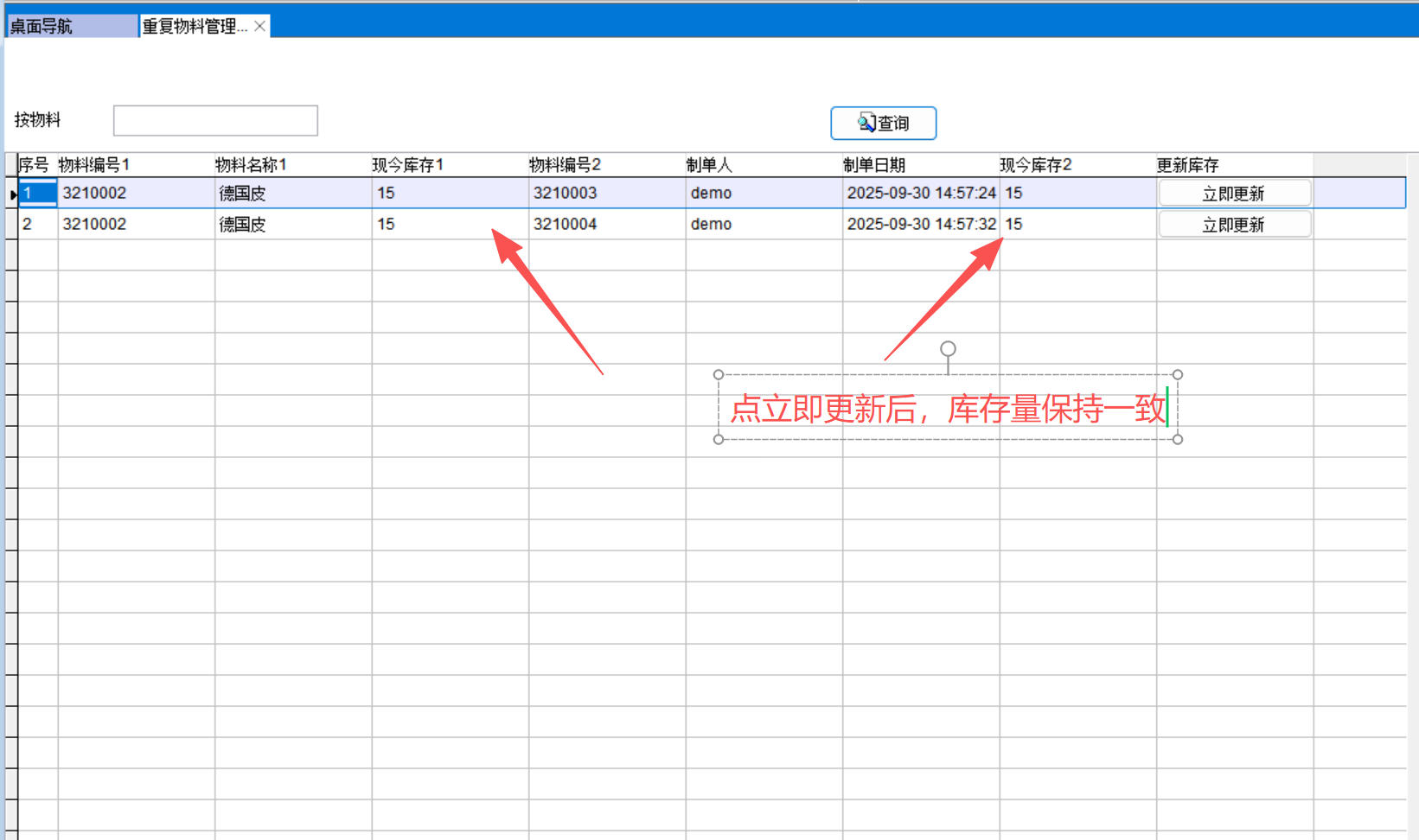 如上圖所示,3210002、3210003、3210004是同一個(gè)物料,名稱都相同,保存后在更新庫(kù)存上點(diǎn)立即更新,更新后3個(gè)物料的庫(kù)存就會(huì)保持一致,以后任意一個(gè)物料的出入庫(kù)后,其他兩個(gè)物料也會(huì)同步庫(kù)存量。3個(gè)物料會(huì)始終保持庫(kù)存一致。