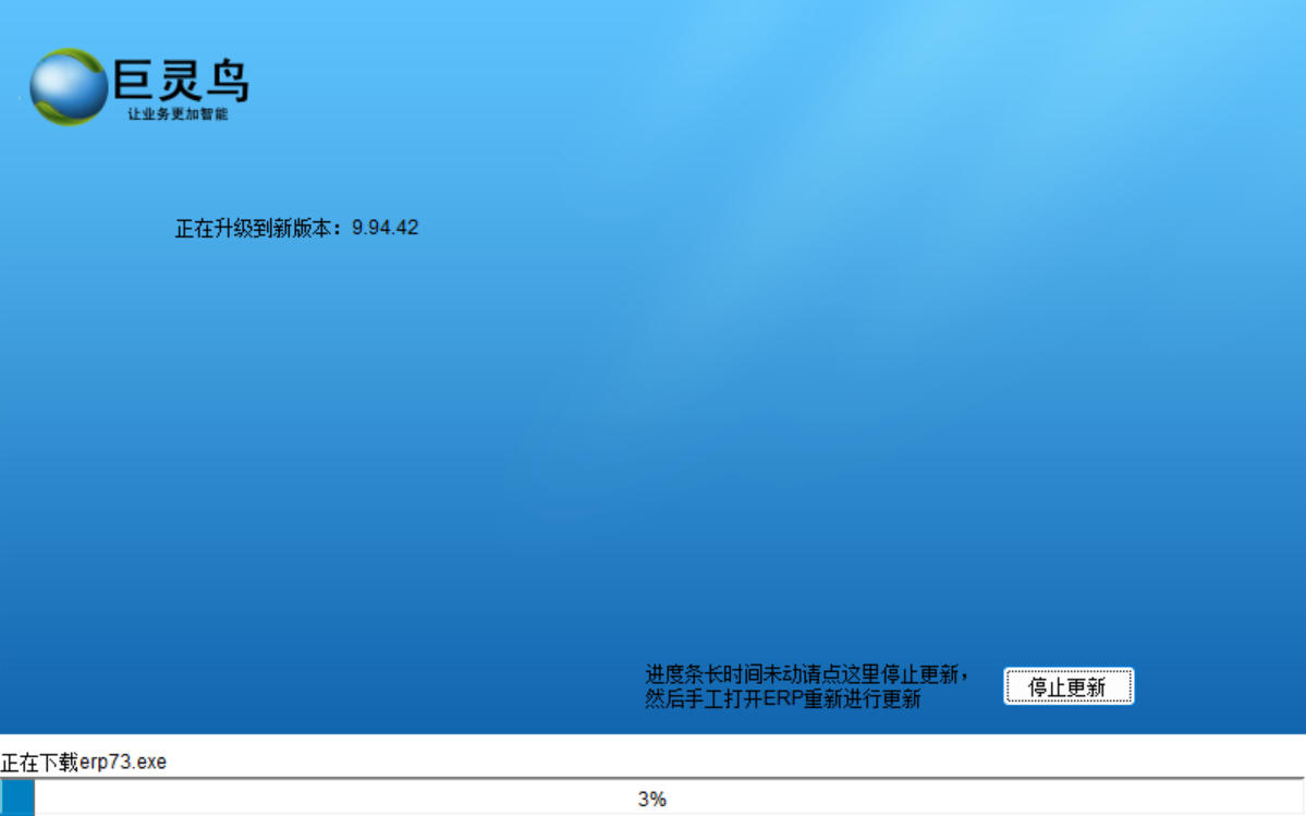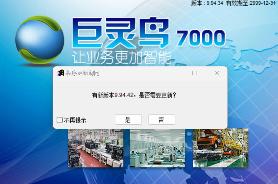 巨靈鳥7000會定期更新程序,如果有新版本,登錄ERP會提示有新版本,點擊是就會自動更新到最新版本。
