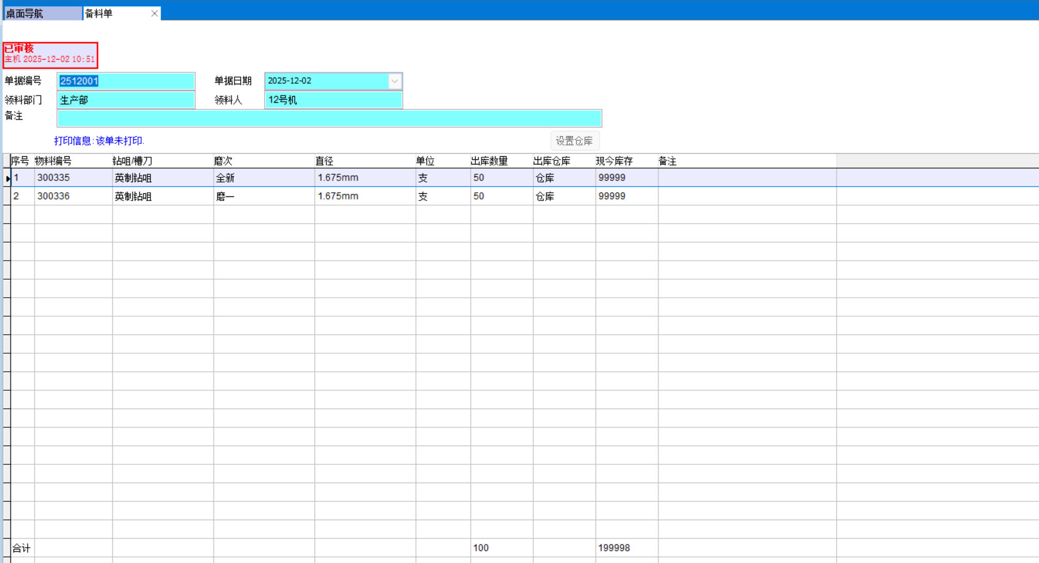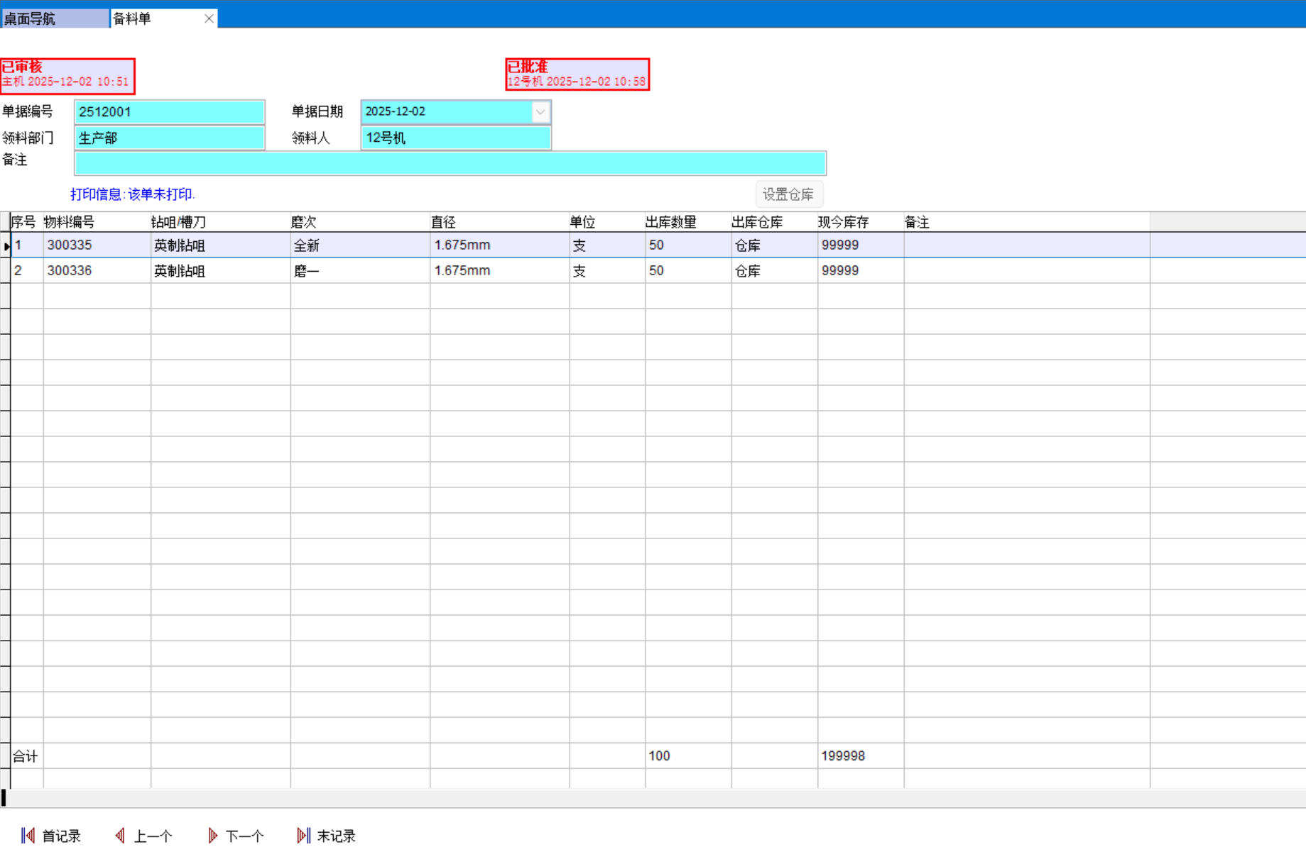 4、車間完成取料后在相同的備料單上點批準,取料看板上該取料信息消除,整個取料工作完成